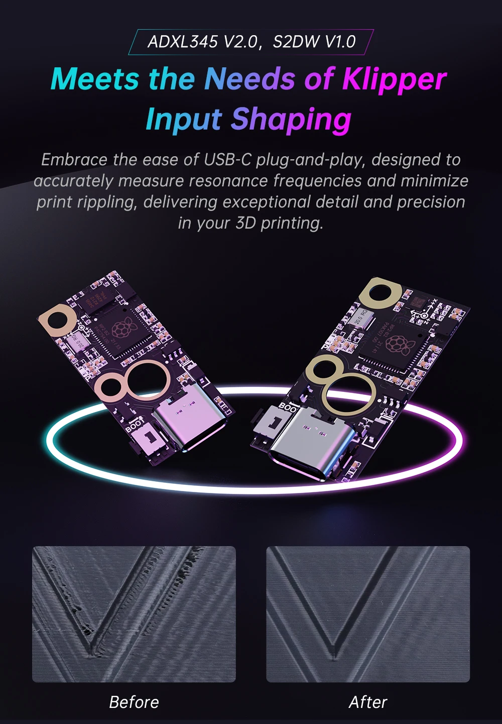 Aproveche la facilidad de la función Plug-and-Play de la USB-C, diseñada para medir con precisión las frecuencias de resonancia y minimizar las ondulaciones de impresión, brindando detalles y precisión excepcionales en su impresión 3D.