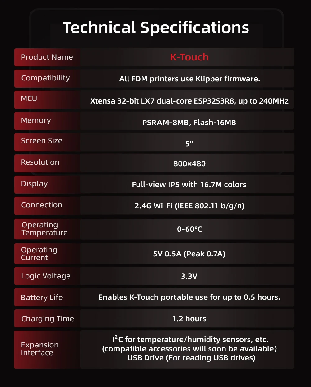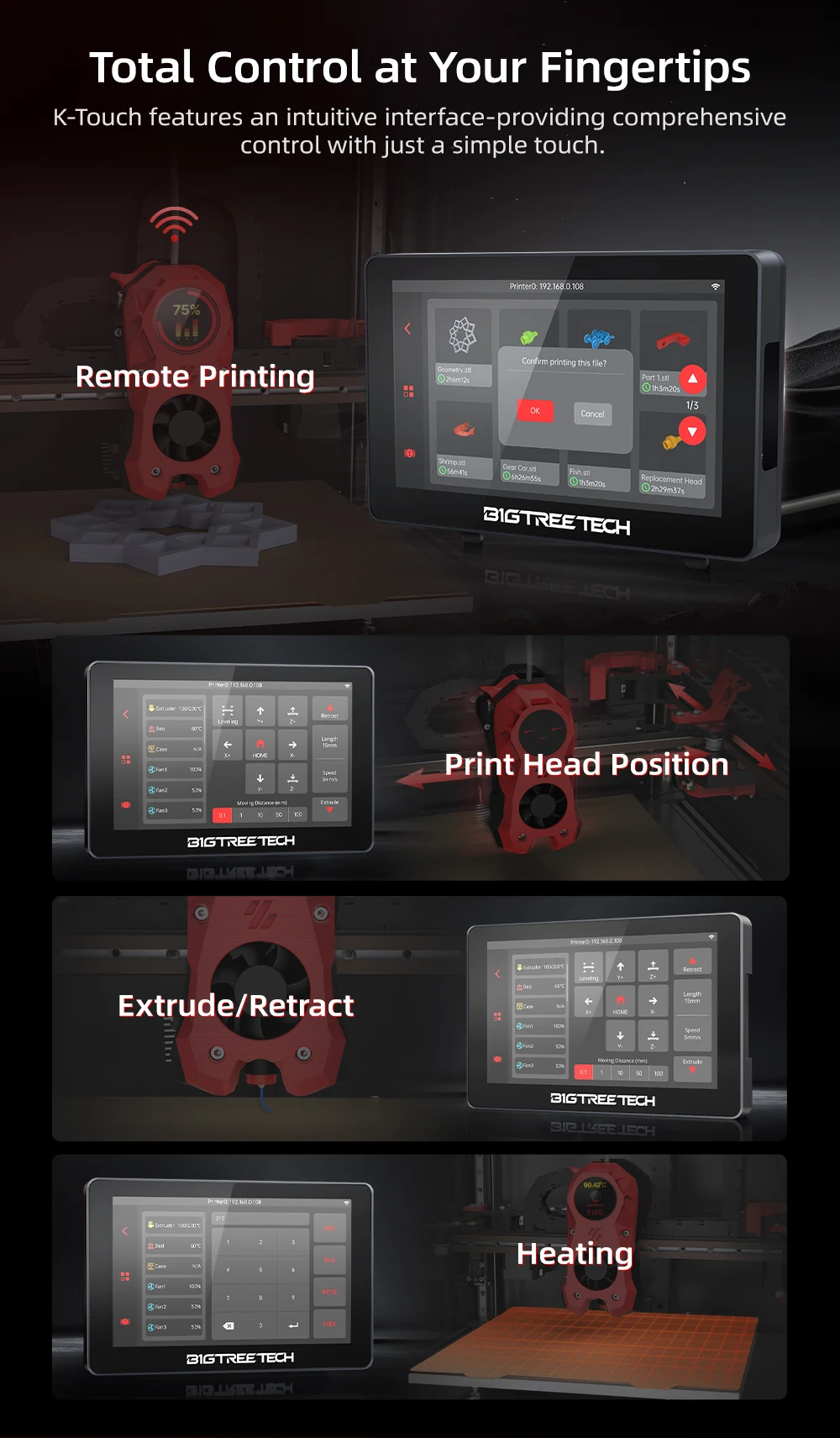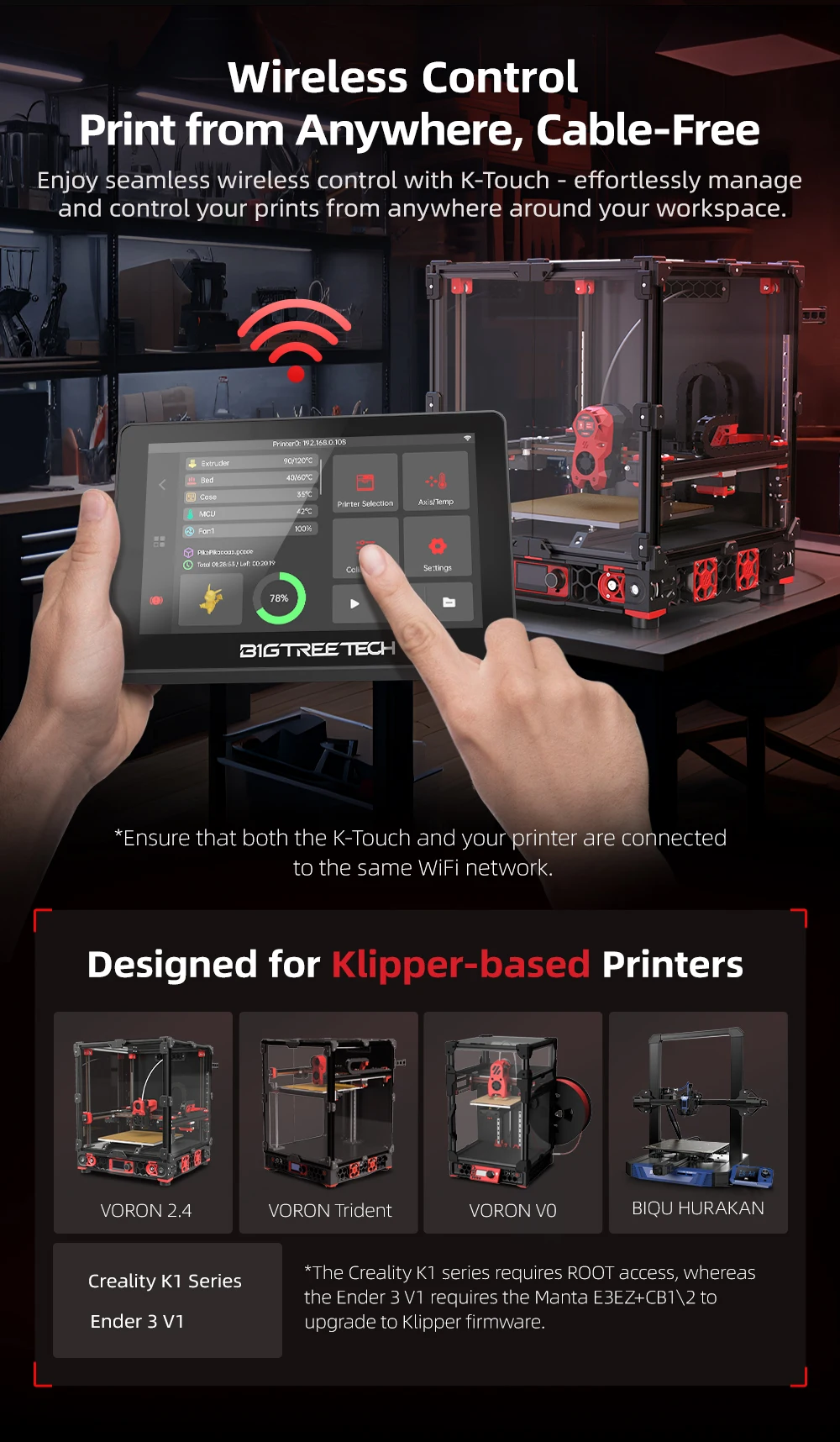¿Por qué K-Touch?1 Klipper para impresoras basadas en Klipper2 Control inalámbrico3 carga magnética4 Impresión remota5 Conexión multipimpresora6 Panel de control integral7 servicios de impresión previa8 Pantalla táctil de 5''