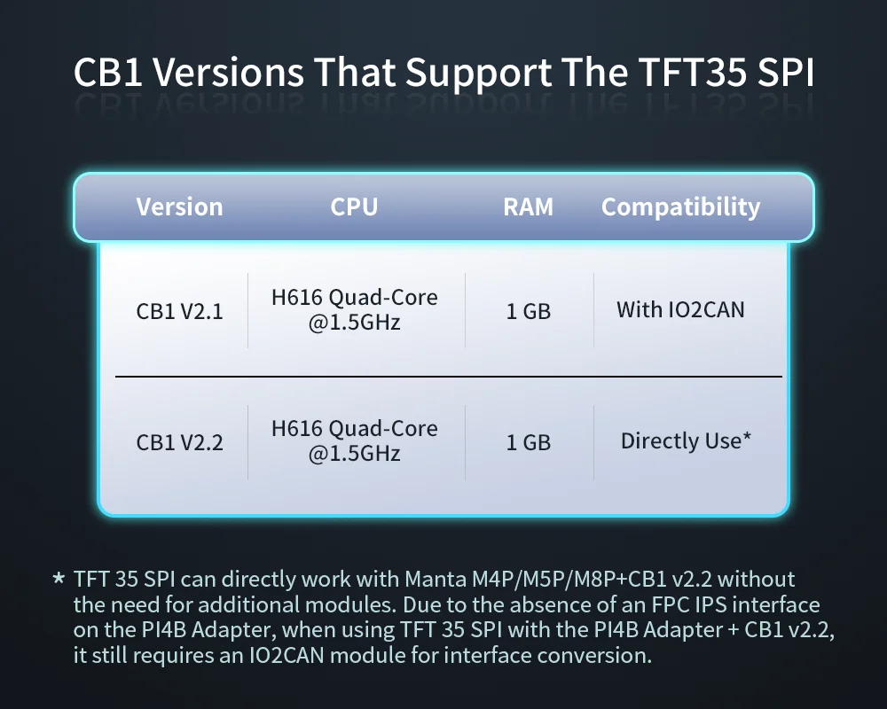 TFT 35 SPI puede trabajar directamente con Manta M4P/M5P/M8P + CB1 v2.2 sin necesidad de módulos adicionales.