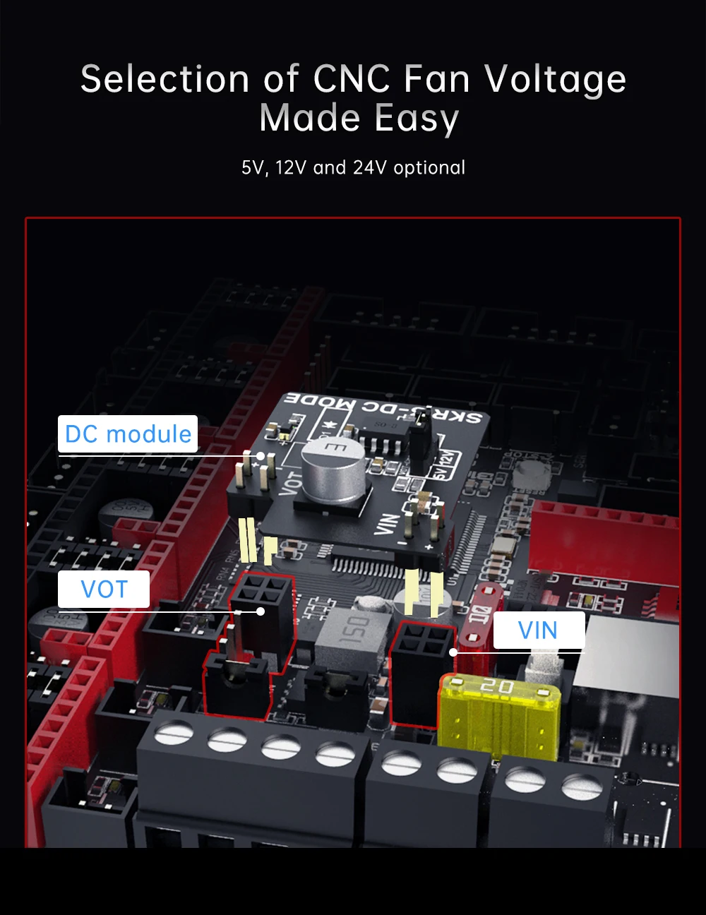 5) As for CNC fan,there is 24V, 12V, 5V voltage selection of the external power supply module , easy to operation, avoid damage to the motherboard.