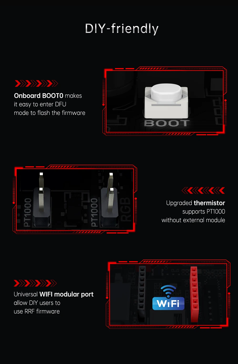 6) WIFI module (ESP12S, ESP-07, ESP32) common interface for customers to DIY and use RRF firmware.