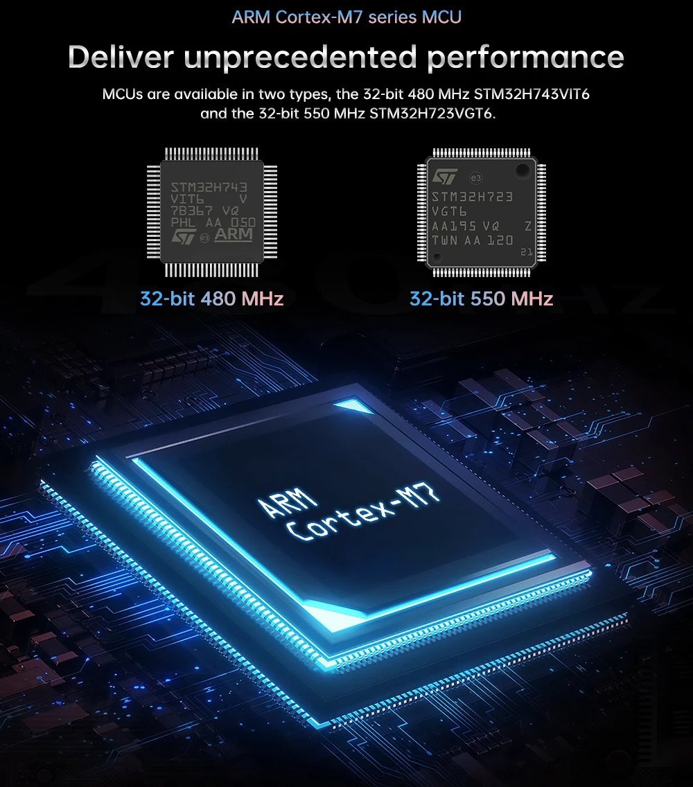32-bit 550MHz ARM-class Cortex-M7 series main control chip STM32H723VGT6, with better performance.