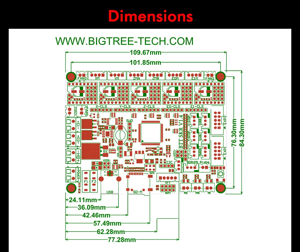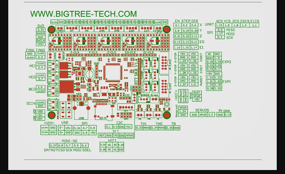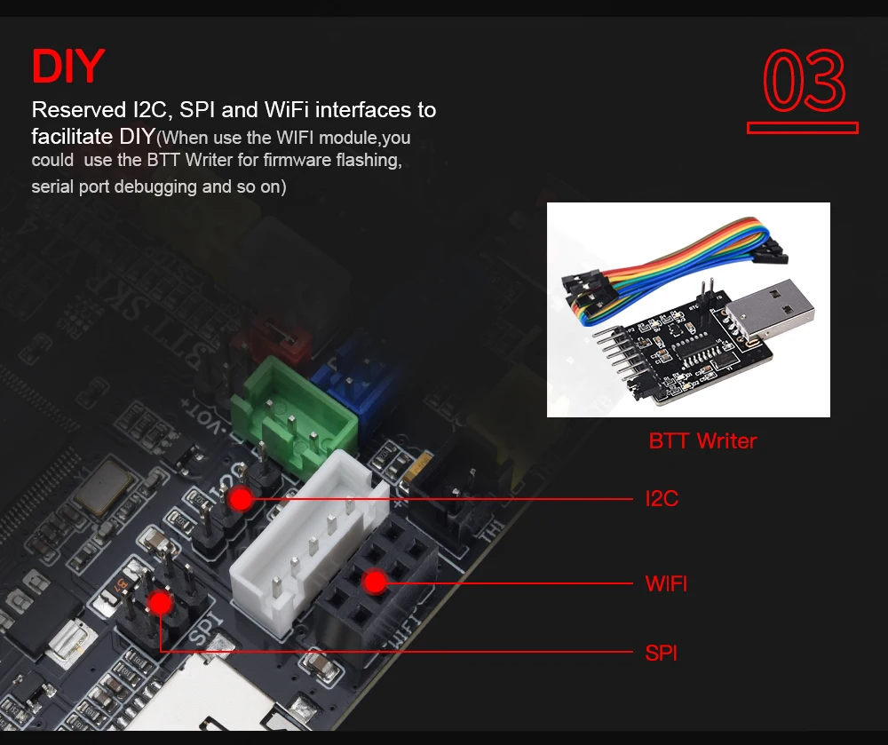 Hazlo tú mismoInterfaces I2C, SPI y WiFi reservadas para facilitar el bricolaje (cuando use el módulo WIFI, puede usar el escritor BTT para la depuración del puerto serie intermitente del firmware, etc.)