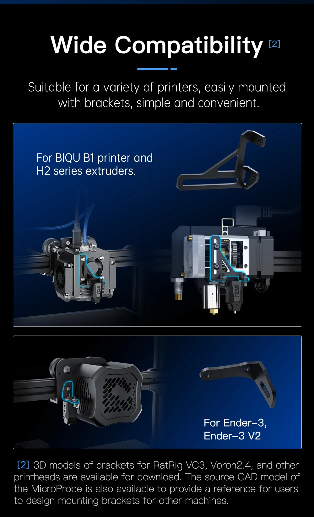 Los modelos 3D de soportes para RatRig VC3, Voron2.4 y otros cabezales de impresión están disponibles para descargar. El modelo CAD de origen de MicroProbe también está disponible para proporcionar una referencia para que los usuarios diseñen soportes de montaje para otras máquinas.