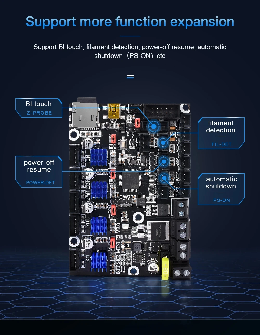 Admite más expansión de funciones:Admite BLtouch, detección de filamentos, reanudación de apagado, apagado automático (PS-ON), etc.