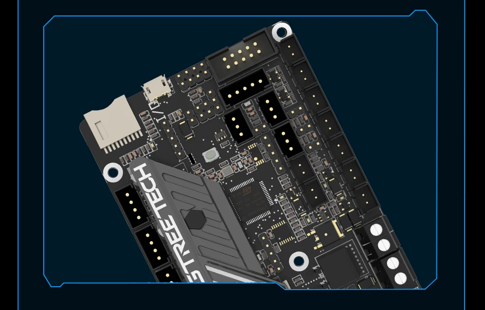 Independientemente de la MCU utilizada, el SKR MINI E3 V3.0 presenta lo siguiente: 4 controladores TMC2209 integrados (con interfaz UART), 3 puertos de ventilador CNC, admite 4 controladores de motor paso a paso (X, Y, Z (eje Z dual), E0 ) y 2 puertos NTC.Además, también proporciona las siguientes interfaces: cama calefactable xl, cartucho calefactor x1, tarjeta SD x1, Micro USB x1, pantalla LCD x1.Pantalla TFT x1, apagado automático xl, recuperación de pérdida de energía x1, RGB x1, BLTouch x1, sensor de agotamiento de filamento x1 y interruptor de límite del eje X/Y/Z x1.Enviaremos aleatoriamente el SKR MINI E3 V3.0 equipado con STM32GOBORET6 o STM32GOB1RET6