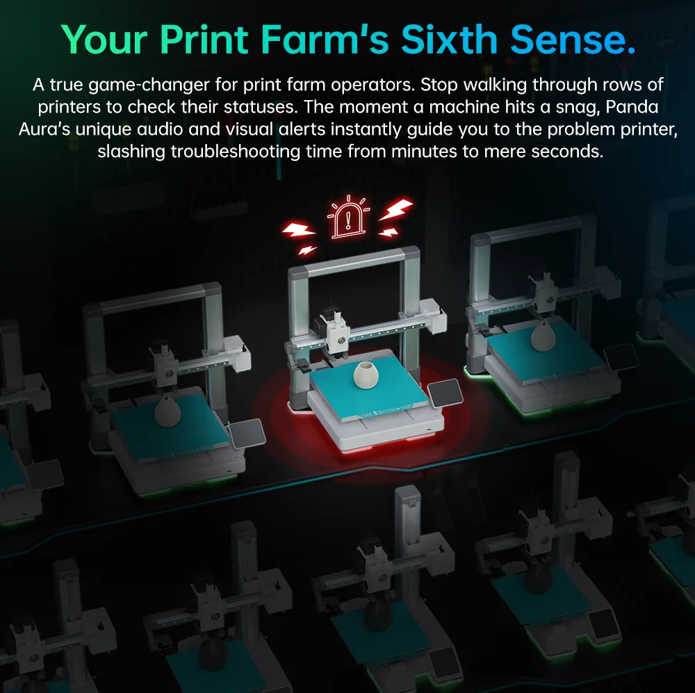 Un verdadero cambio de juego para los operadores de la granja impresa.Deje de caminar por filas de impresoras para comprobar sus estado.En el momento en que una máquina llega a un obstacle, las alertas visuales y de audio únicas de Panda Aura lo guiarán instantáneamente a la impresora con problemas, reduciendo el tiempo de resolución de problemas de minutos a simple segundo.