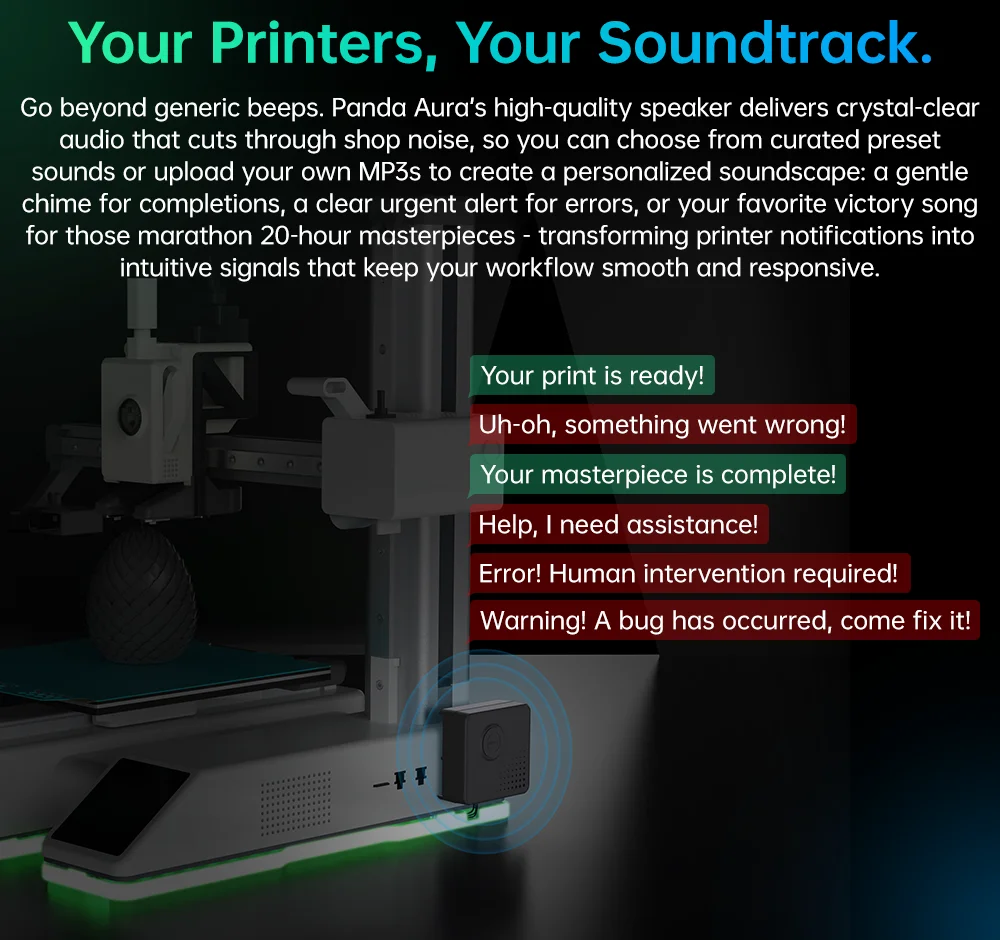 Va más allá de los pitidos genéricos.El altavoz de alta calidad de Panda Aura ofrece un audio nítido que elimina el ruido de la tienda, por lo que puede elegir entre sonidos preestablecidos seleccionados o cargar sus propios MP3 para crear un paisaje sonoro personalizado: un timbre suave para completar, una alerta clara y urgente de errores. o su canción de victoria favorita para esas maratones, obras maestras de 20 horas: transforma las notificaciones de la impresora en señales intuitivas que mantienen su flujo de trabajo fluido y receptivo.