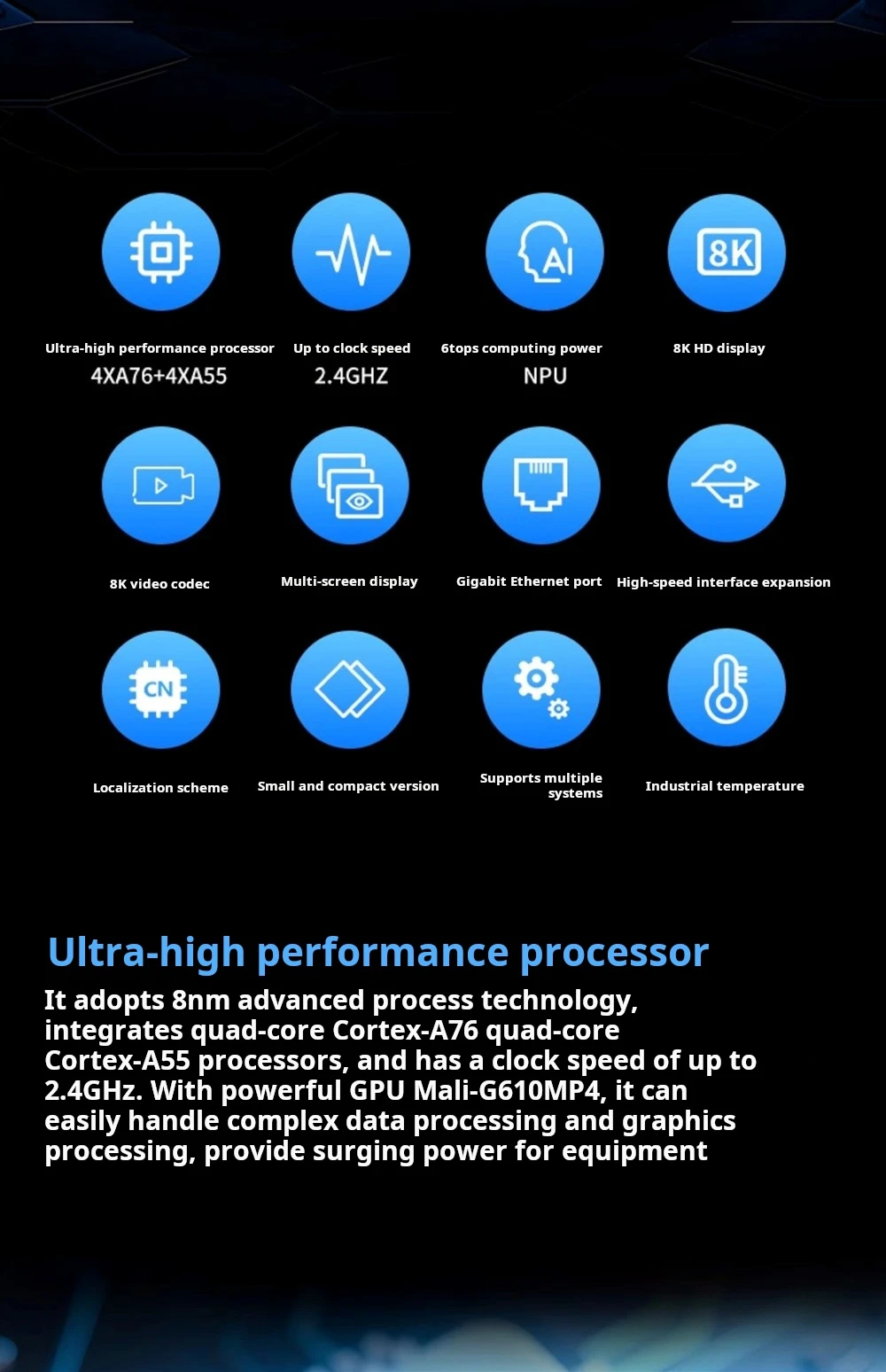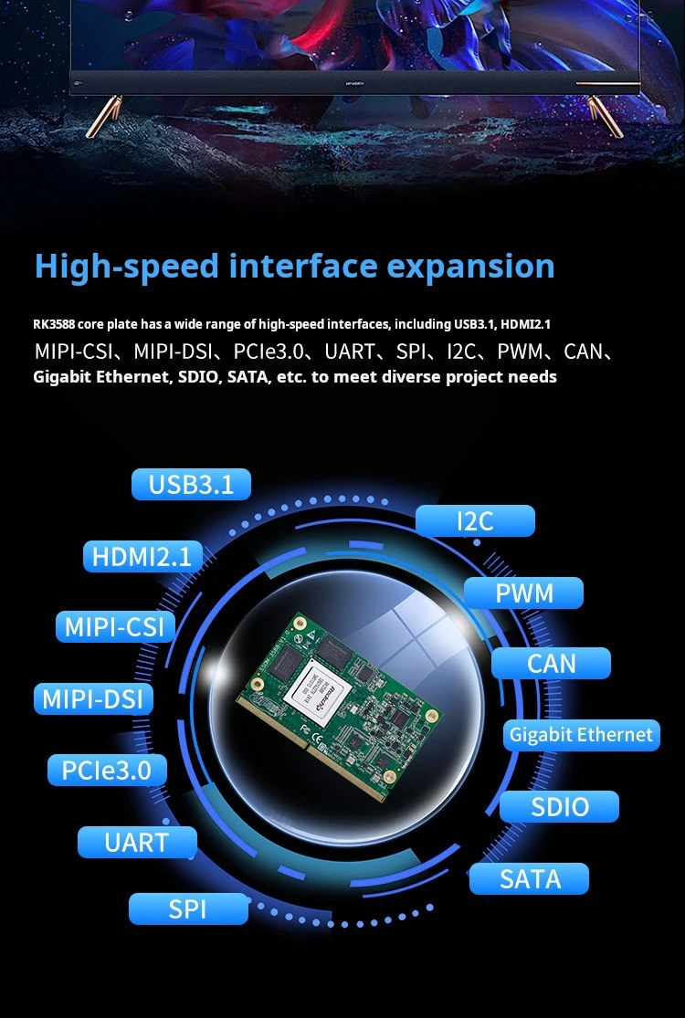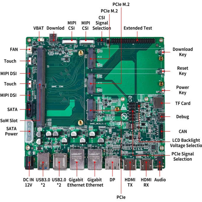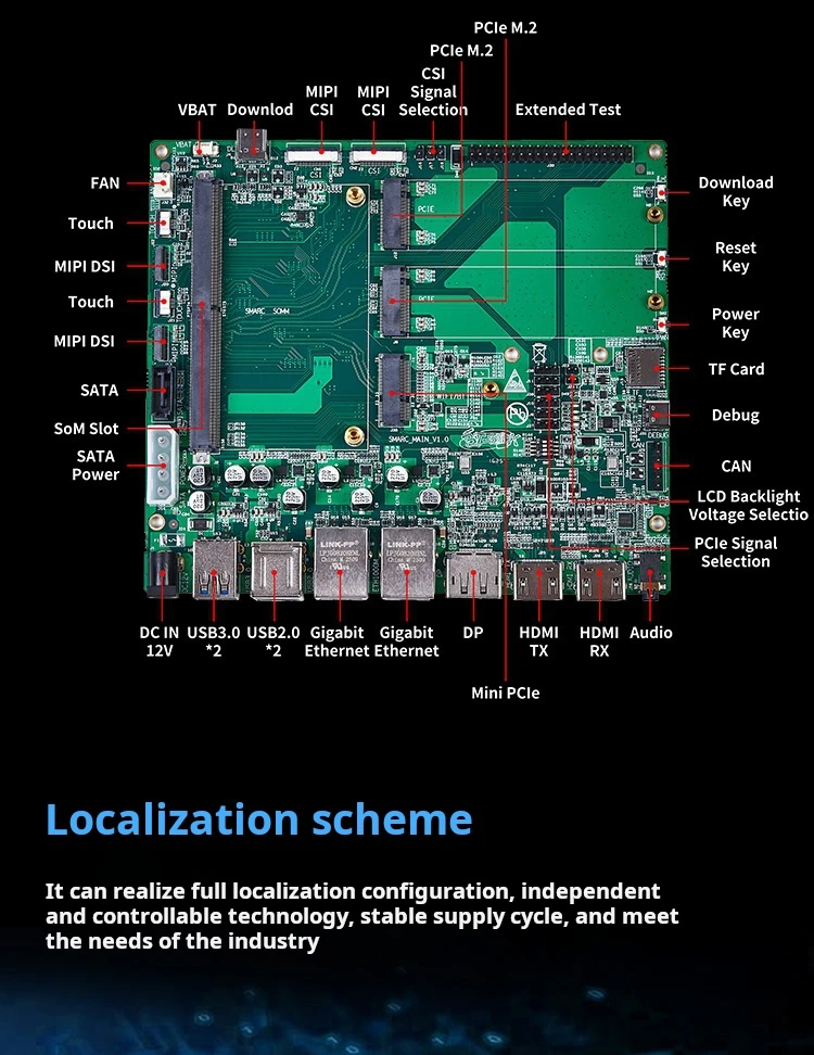 1.6-TOPS AI acelerador integrado en el SoC RK3588 para una inferencia en tiempo real. 2.Decodificación 8K60 H.265/VP9 y codificación 8K30, que permite medios y análisis ultra-HD. 3.Conector SMARC 2.1 para integración plug-and-play con placas portadoras. 4.BSP domésticos de doble arranque para Linux y Android, totalmente de código abierto para una personalización rápida. E/S de nivel servidor: Dual GbE, PCIe 3.0, USB 3.1, MIPI-CSI/DSI, compatible con proyectos complejos de IoT y bricolaje. Imágenes detalladas