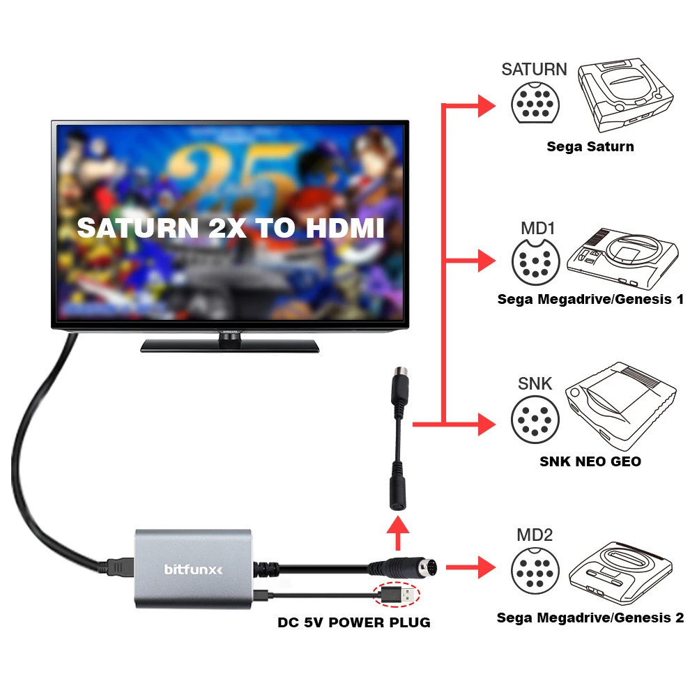 La mayoría de los televisores modernos tienen conectividad a través de HDMI y carecen de algunas de las entradas más antiguas que utilizan las consolas retro. Con los cables adaptadores HDMI Bitfunx, puede traer sus consolas antiguas como SEGA Saturn, megadrive y Neo Geo CD vuelven a la vida en un televisor más nuevo y revive esos juegos clásicos con una simple solución "Plug and Play".
