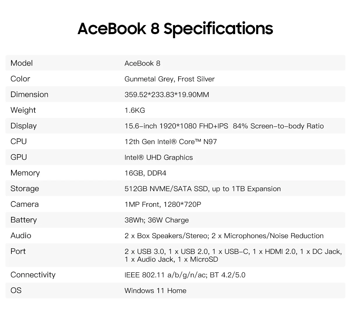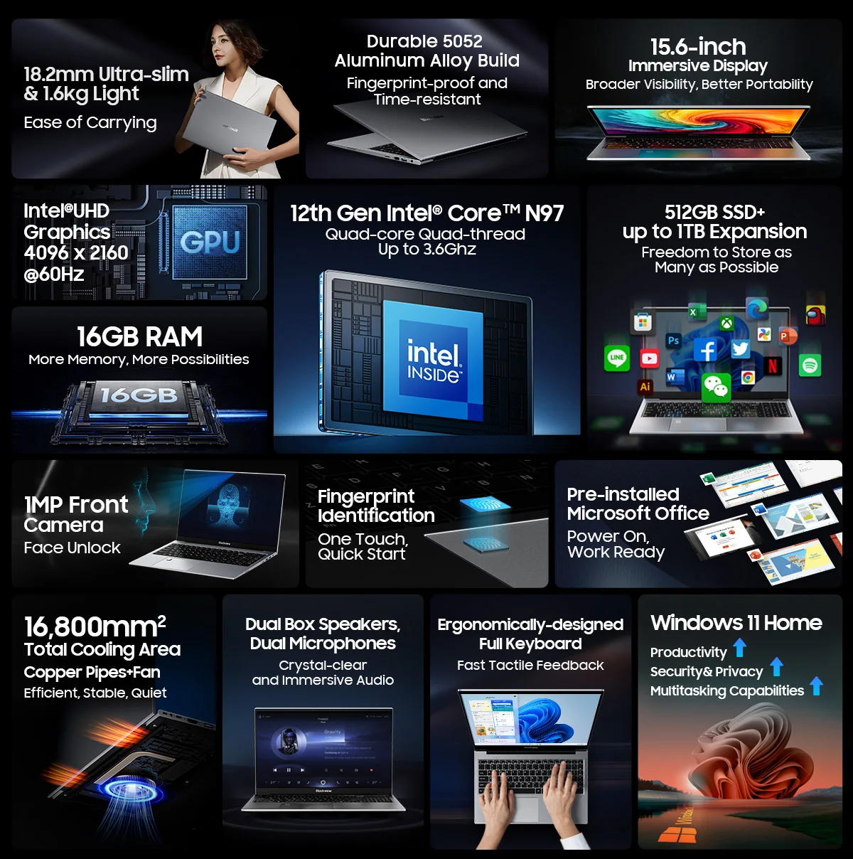 Comprar Blackview Acebook 8 portátil 15,6 ''Win 11 12a generación procesador Intel Core N97 16GB DDR4 512GB SSD 5000mAh batería con carga de 36W