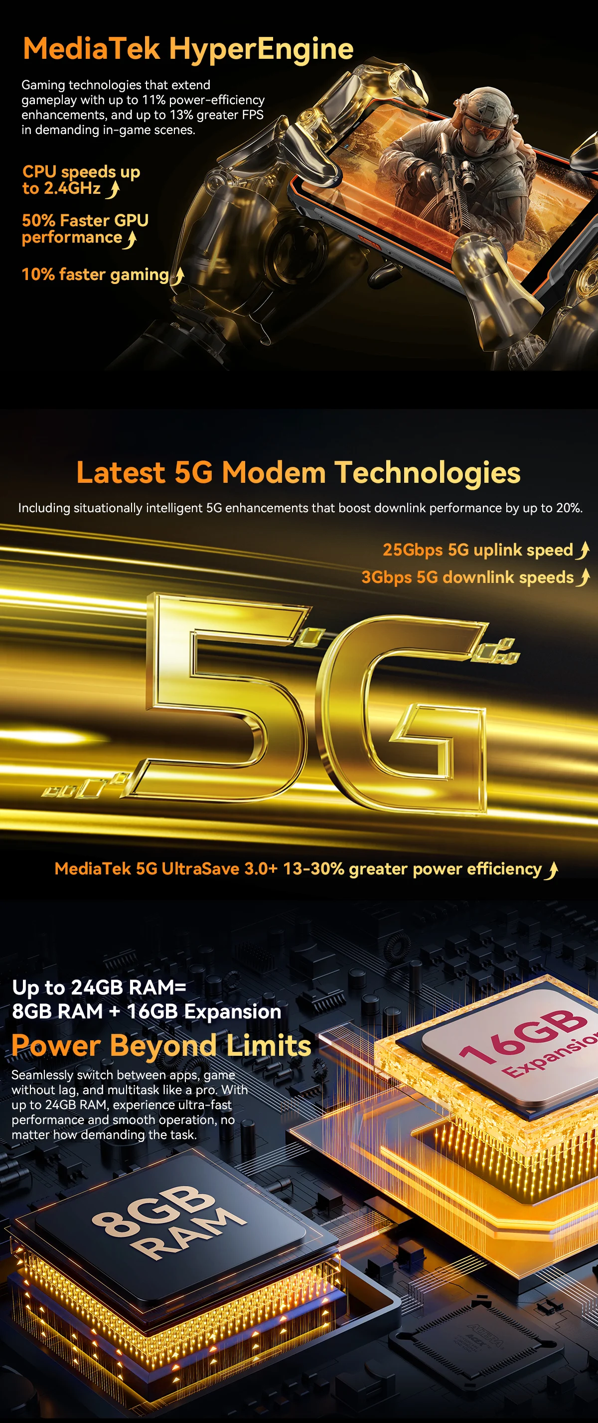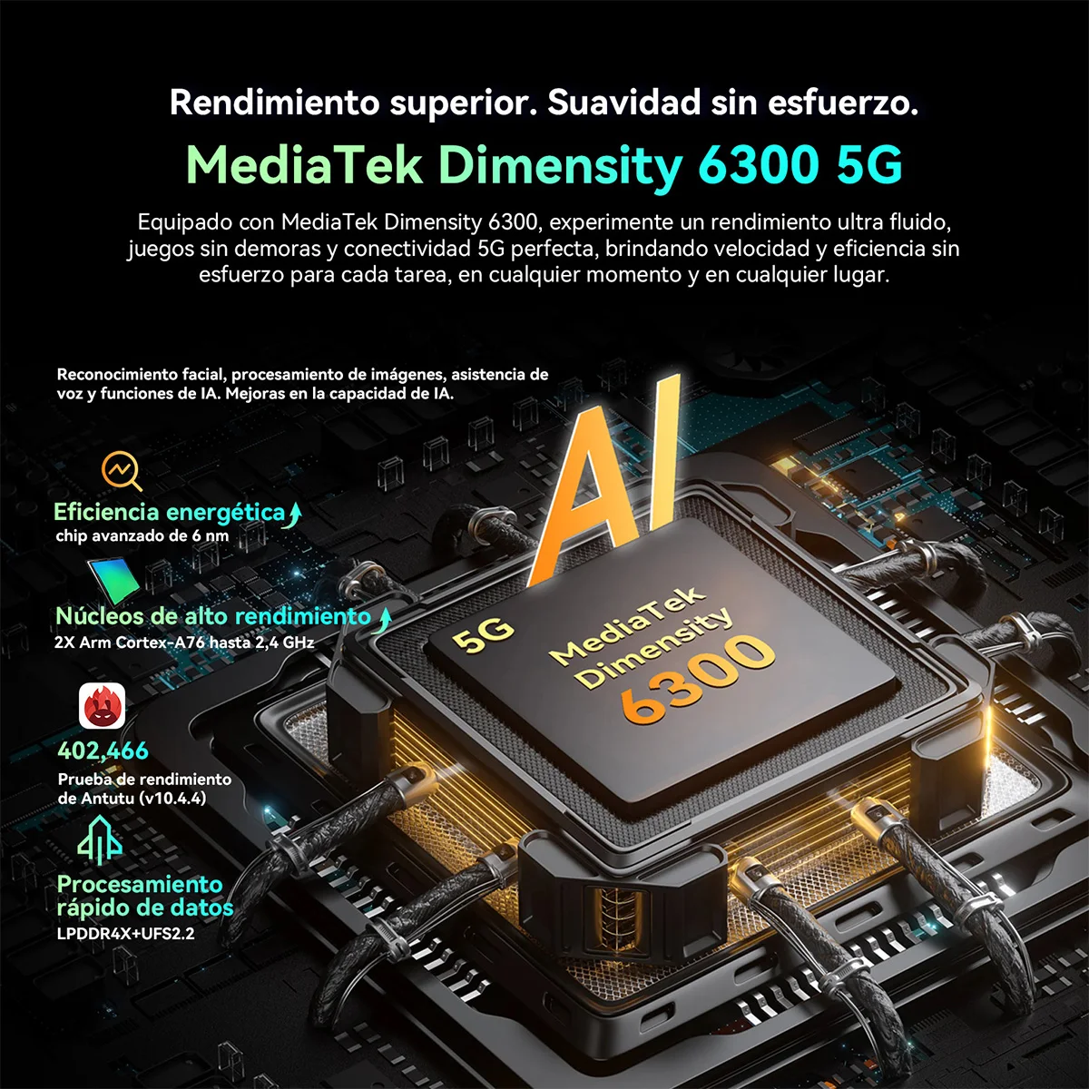 CPU:5G MediaTek Dimensión 6300; Hasta 2,4 GHZ