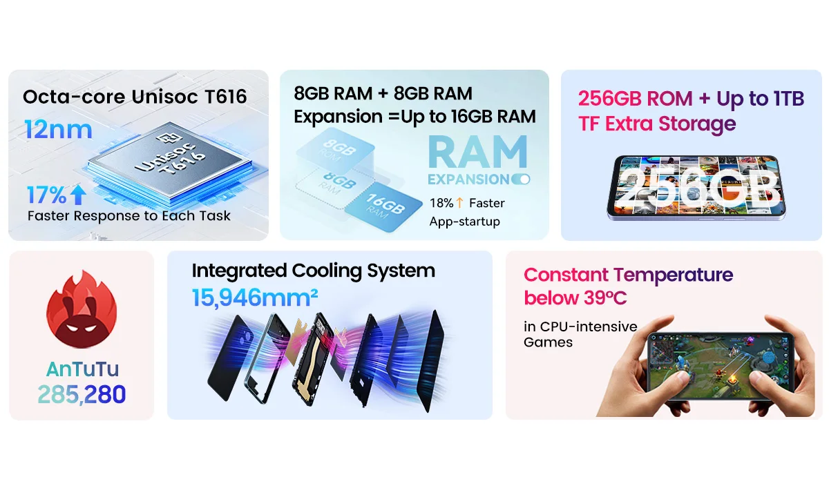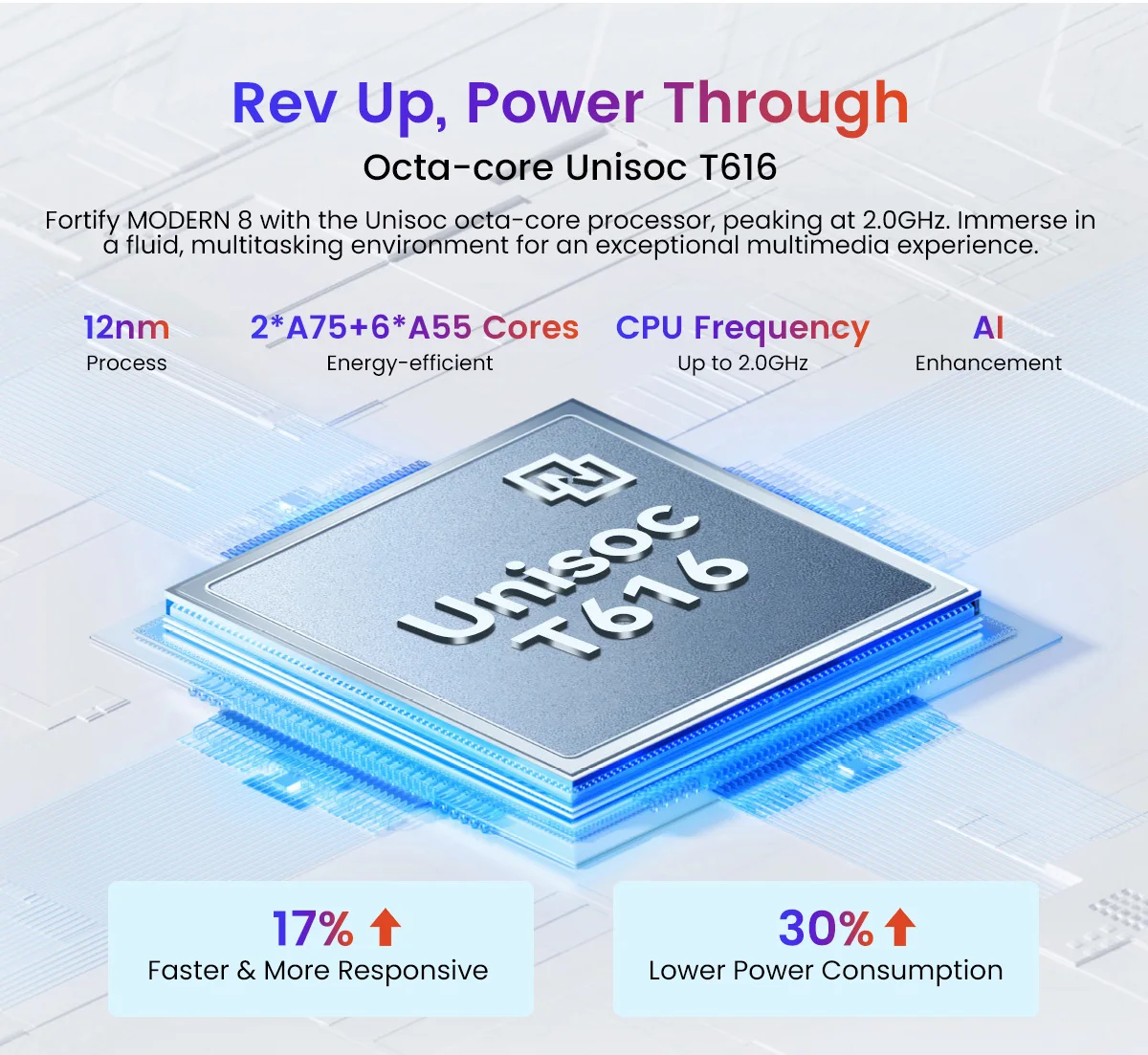 CPU:T616, núcleo Octa, Cortex-A75 @ 1,6 GHz*2, Cortex-A55 @ 1,6 GHz*6