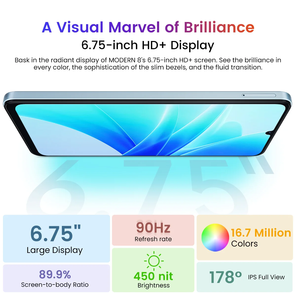 Pantalla:Pantalla HD de 6,75 pulgadas + IPS 720*1600 90Hz
