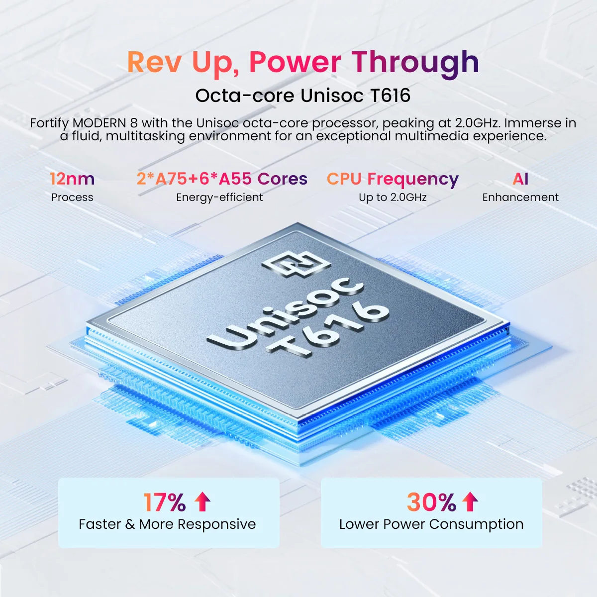 CPU:T616, núcleo Octa, Cortex-A75 @ 1,6 GHz*2, Cortex-A55 @ 1,6 GHz*6