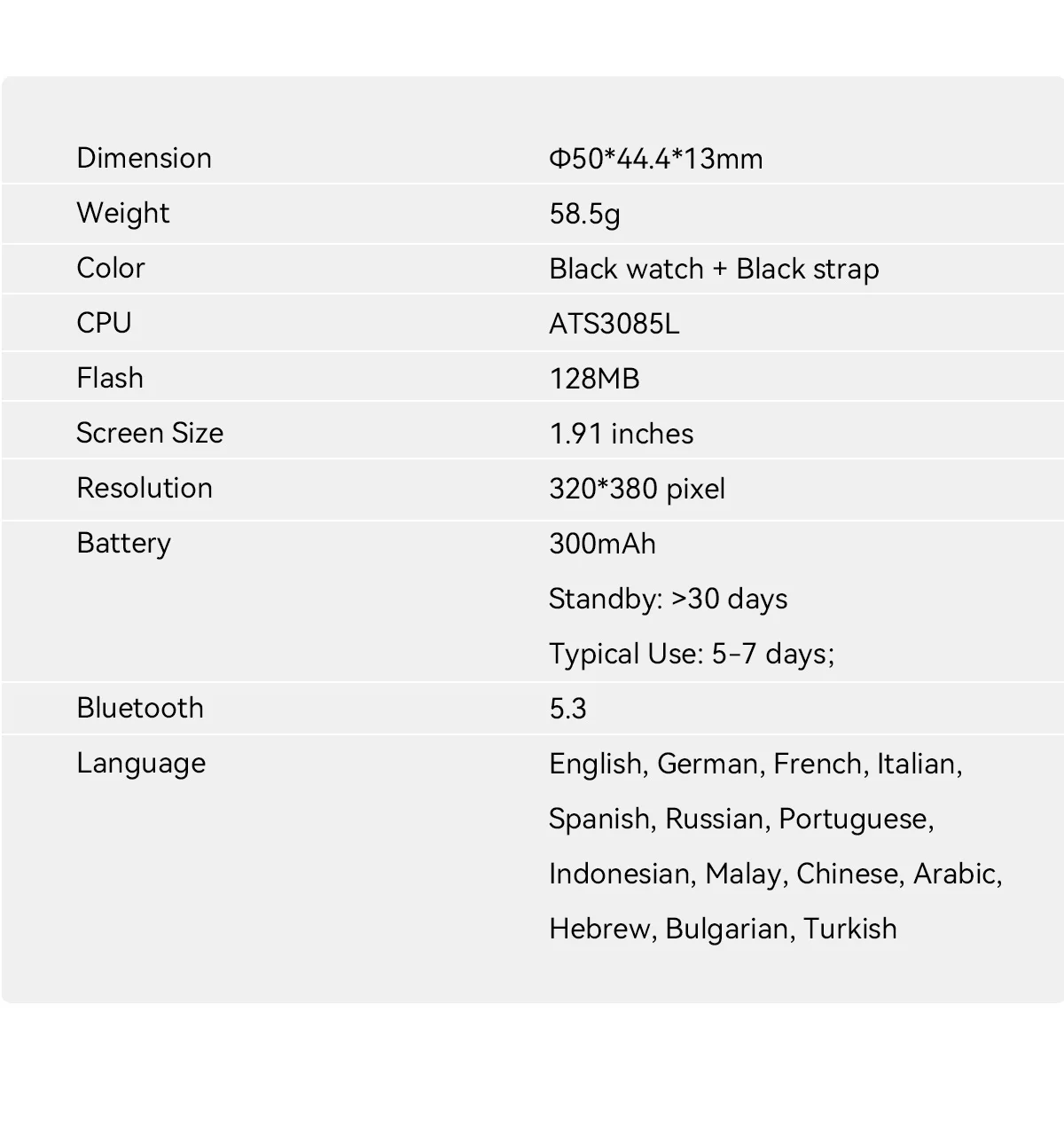 Dimensión:Peso:Color:CPU:Flash:Tamaño de pantalla:Resolución:Batería:Espera:Uso típico:Bluetooth:Idioma: