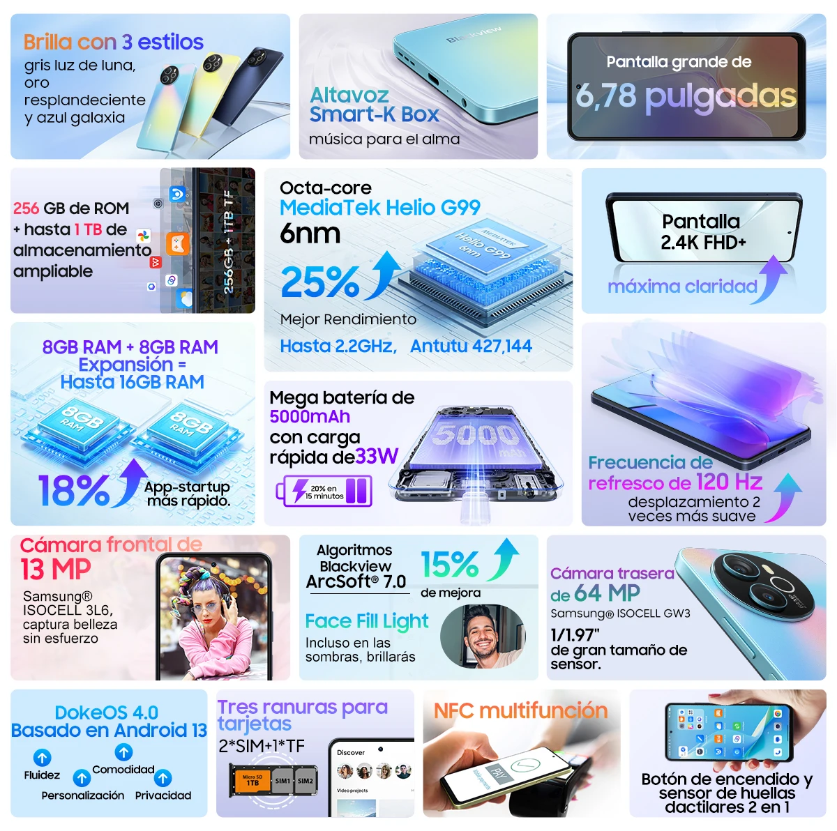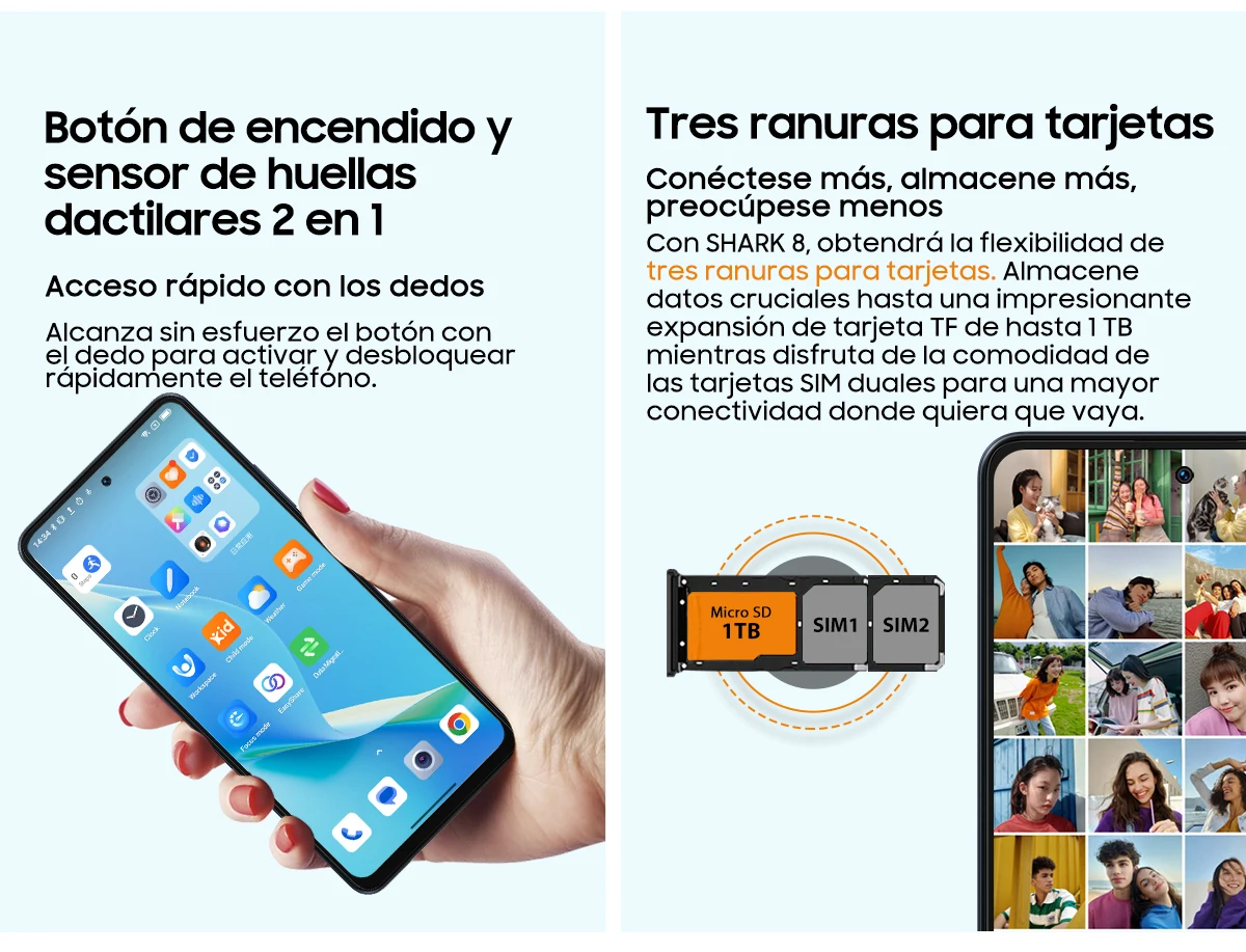 Otras características:OTG, FM, NFC, Google Play, Huella Digital
