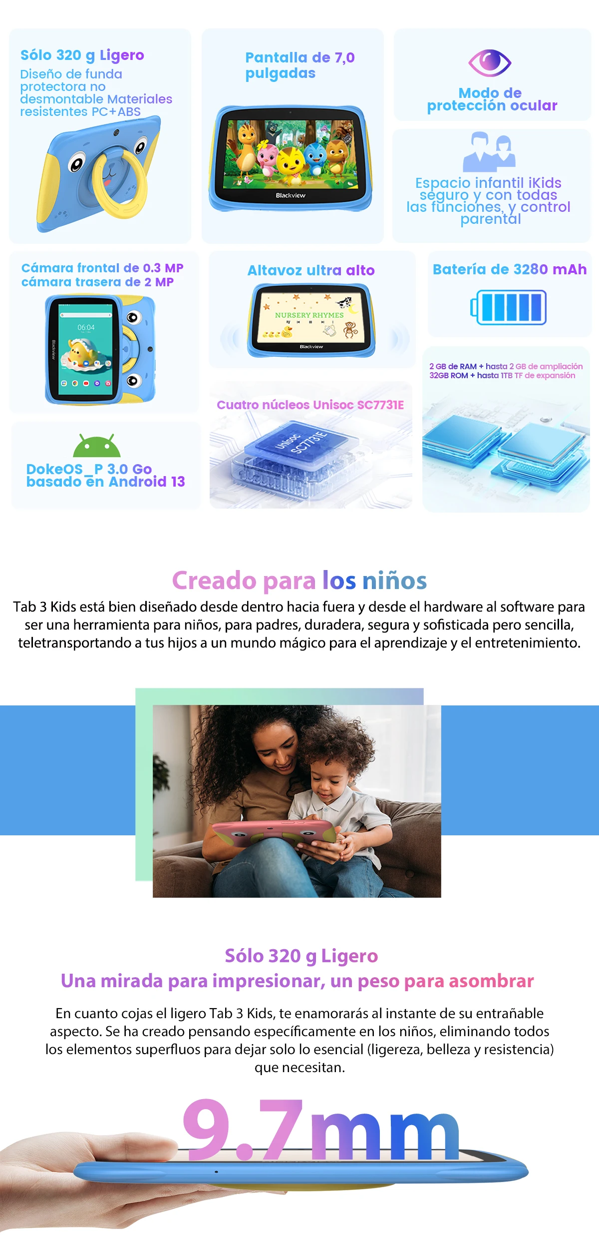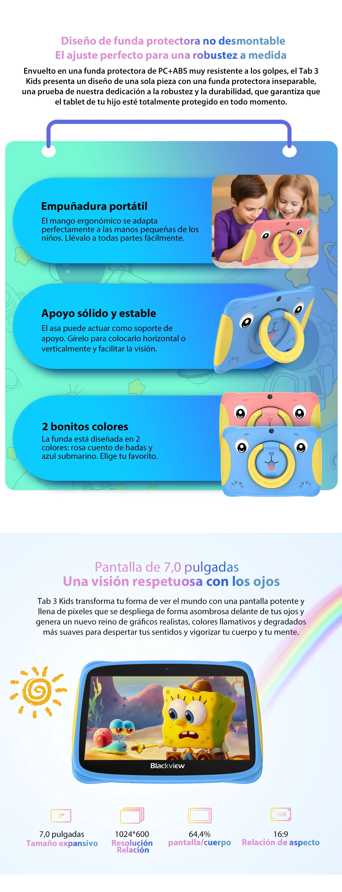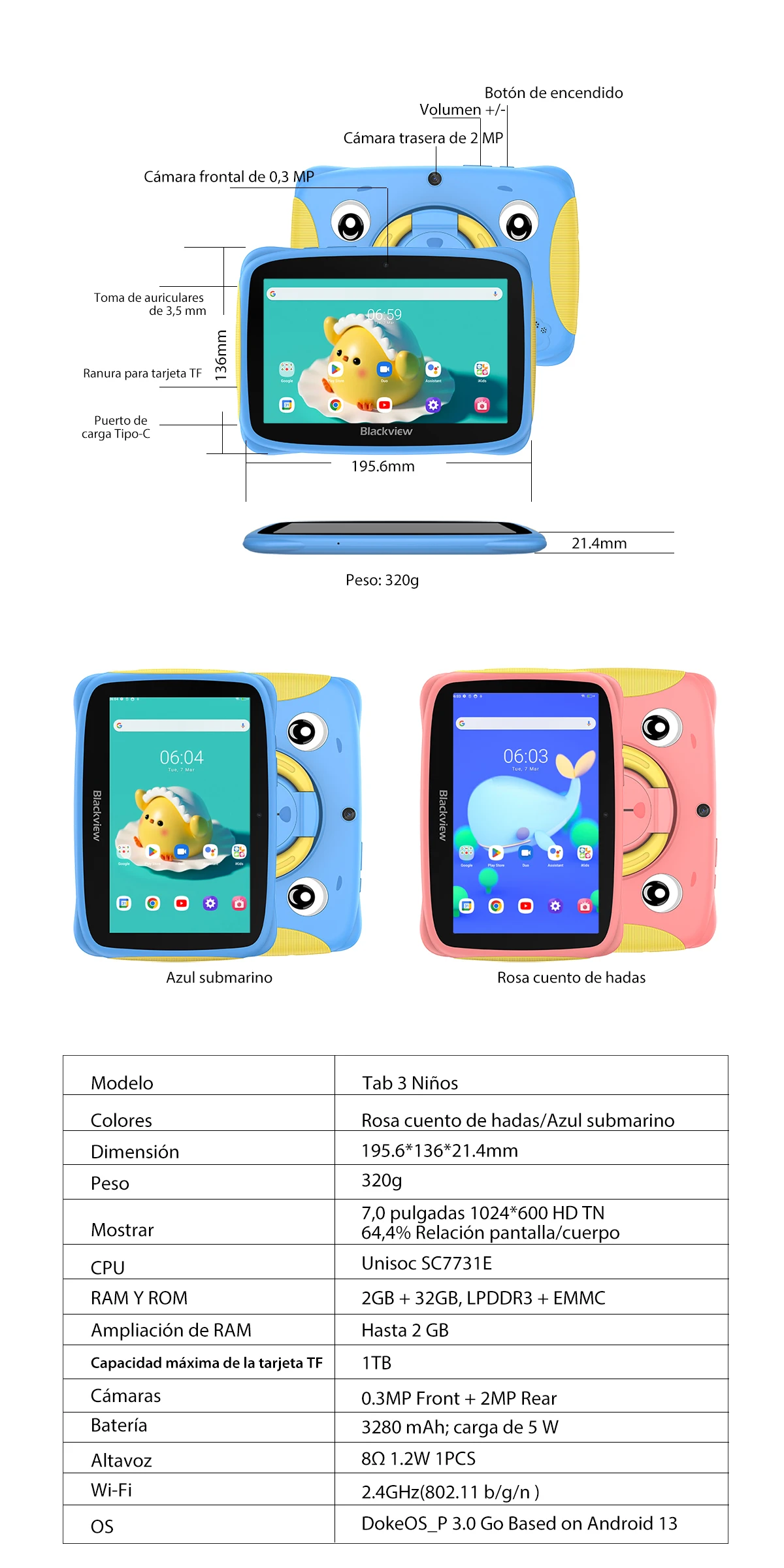 Comprar Blackview Tab 3 niños pantalla HD de 7 pulgadas tableta para niños 2GB RAM 32GB ROM, Android 13 Tablet PC Quad Core Wifi para estudio educación