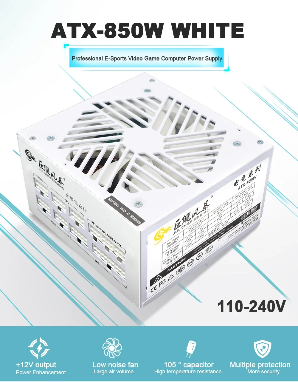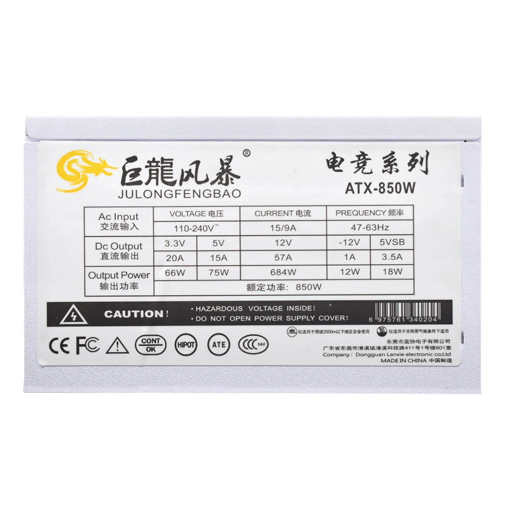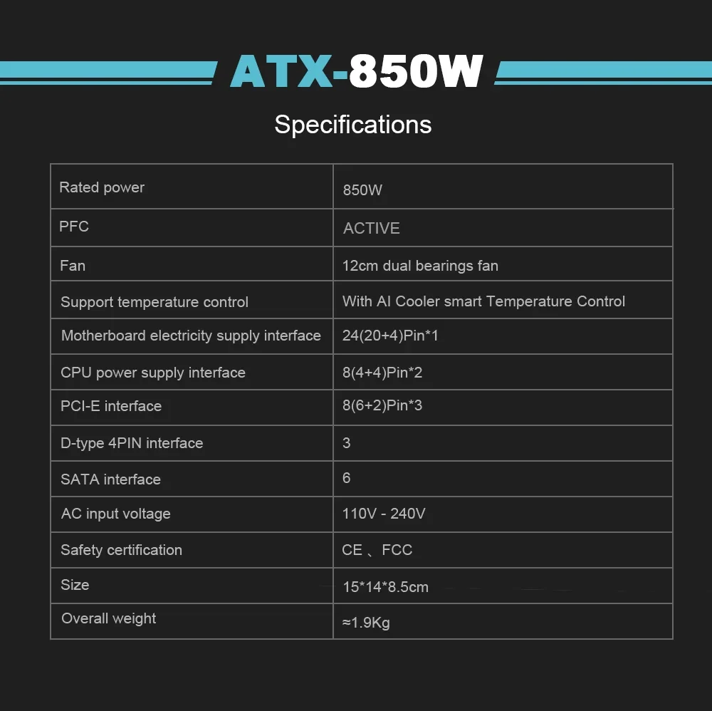 • Salida de alta potencia:Con una potencia de salida de 850 W, esta fuente de alimentación proporciona amplia potencia para su computadora de videojuegos E-Sports, lo que garantiza un rendimiento fluido y estable.