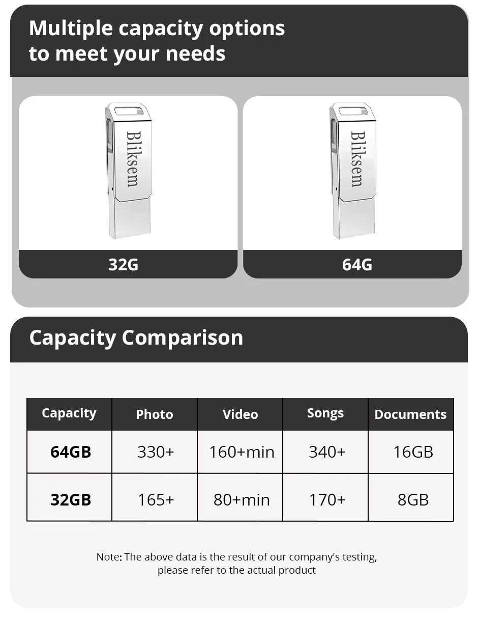 • Capacidad de 32GB o 64GB :Con una capacidad de 32GB o 64GB, este pen drive proporciona suficiente espacio para almacenar todos sus archivos importantes, fotos y videos.
