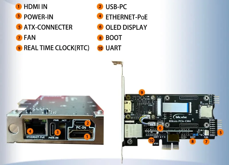 Plug-n-play PCIe Card for KVM-over-IP Solution:Powered by Raspberry Pi CM4(CM4102000 included), designed for BIOS-level, secure and stableremote control of computer equipment
