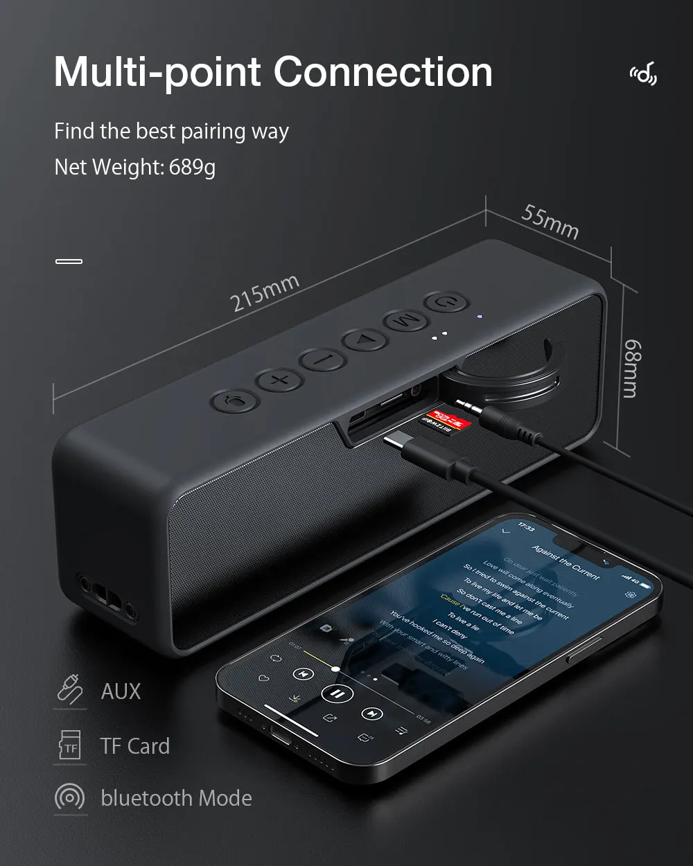 Múltiples conexiones: Bluetooth, tarjeta TF y reproducción AUX, encuentre la mejor forma de emparejamiento.