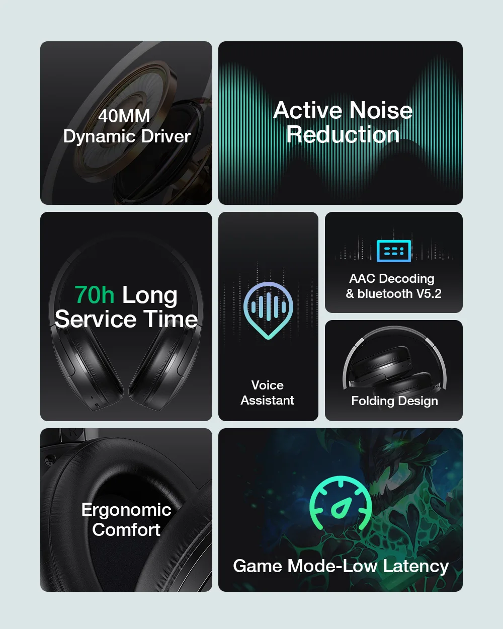 5. Batería de larga duración de 70H: La batería proporciona largas horas de disfrute de la música, por lo que puede escuchar durante más tiempo sin preocuparse por quedarse sin energía.