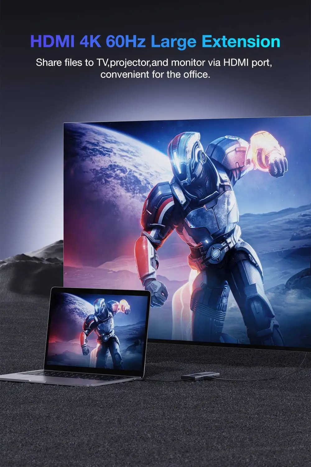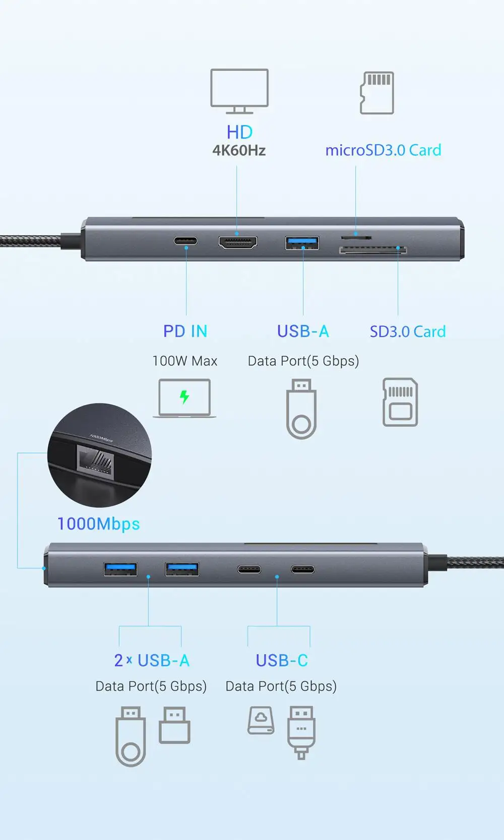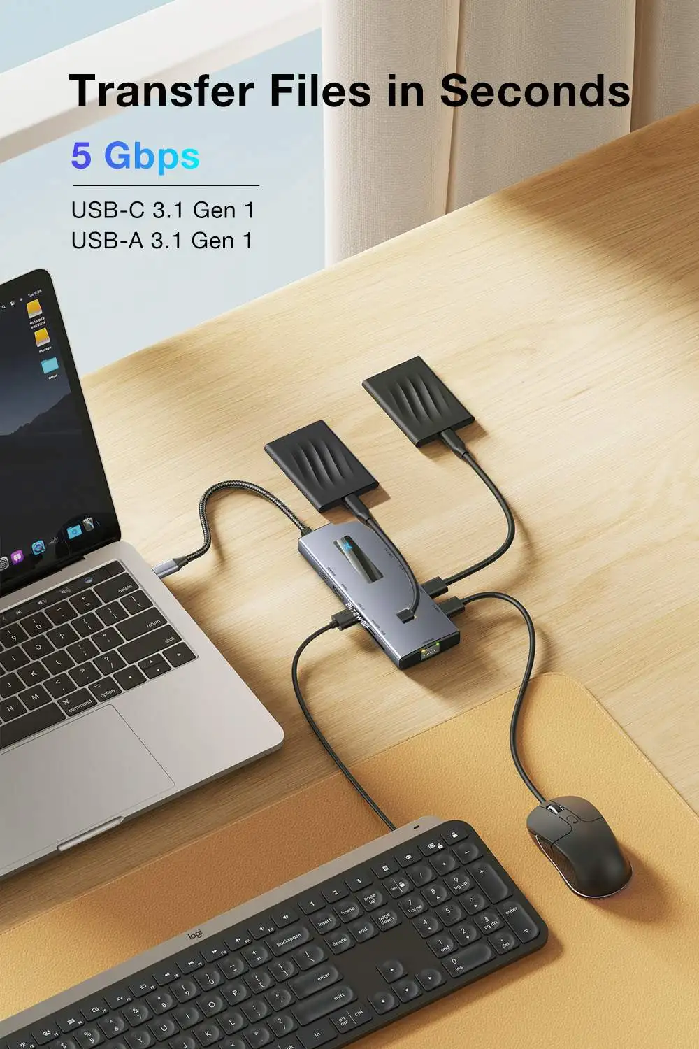 1. Este producto puede ampliar la conectividad y funcionalidad de su ordenador con USB3.10Hub para máxima flexibilidad. Ampliamente utilizado para dispositivos de almacenamiento externo, adaptador de fuente de alimentación de computadora, lector de tarjetas, pantalla 4K a frecuencia de actualización de 60Hz, carga rápida PD 100W, interfaz de red con cable Gigabit, hub USB3.0 y así sucesivamente. Transmisión y extensión 3,0 estándar completa.