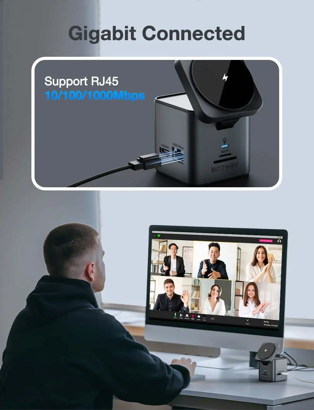 Comprar BlitzWolf-estación de acoplamiento BW-TH17 tipo C 9 en 1, cargador inalámbrico magnético de 15W, concentrador de USB-C con USB3.0 x 3 HD 4K @ 30Hz Gigabit