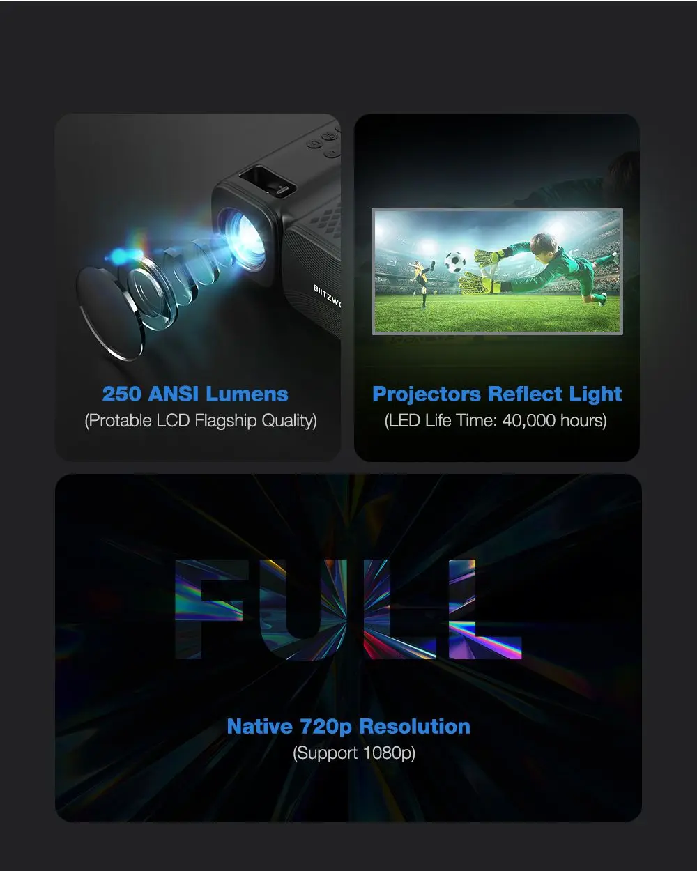 1. Admite decodificación de reproducción de imágenes de 1080P, resaltado de 250 lúmenes ANSI, se puede ver en interiores y exteriores