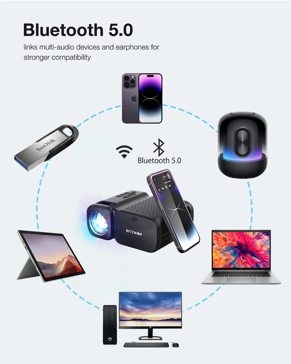 Comprar Blitzwolf-Mini proyector WIFI V3, 5G, WIFI, pantalla de espejo inalámbrica 1080P, compatible con Bluetooth 5,0, 250 Lúmenes ANSI, portátil, para exteriores