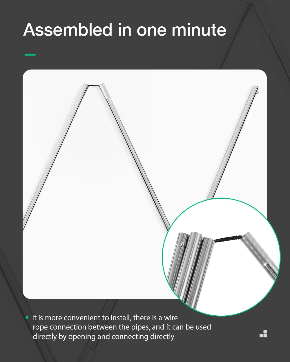 2. El marco está hecho de tubos de acero inoxidable 201, que están empalmados por múltiples secciones. Se instalan Cuerdas elásticas en los tubos de cada grupo de varillas para hacer el empalme. El proceso es más simple y menos propenso a errores; la Cortina también se puede plegar a voluntad, por lo que el paquete general es pequeño y fácil de transportar después del desmontaje.