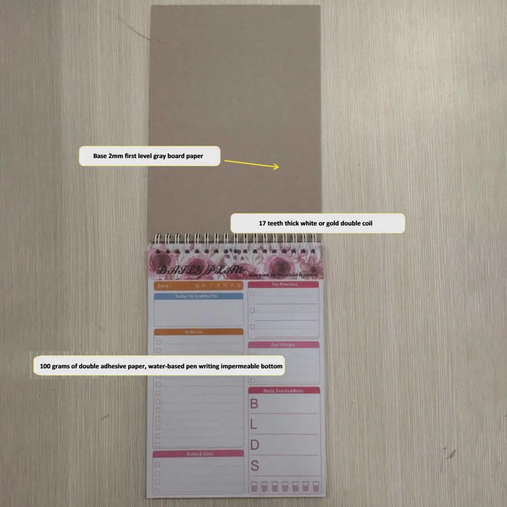 Características: encuadernación de doble alambre, papel grueso, escritura suave