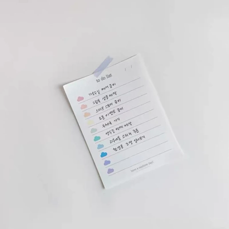 Lista coreana con nubes coloridas para hacer Tamaño: 8X10,6 cm Especificaciones: 50 hojas Cohesivo, se puede utilizar con cinta y pegatinas Embalaje de bolsa OPP independiente