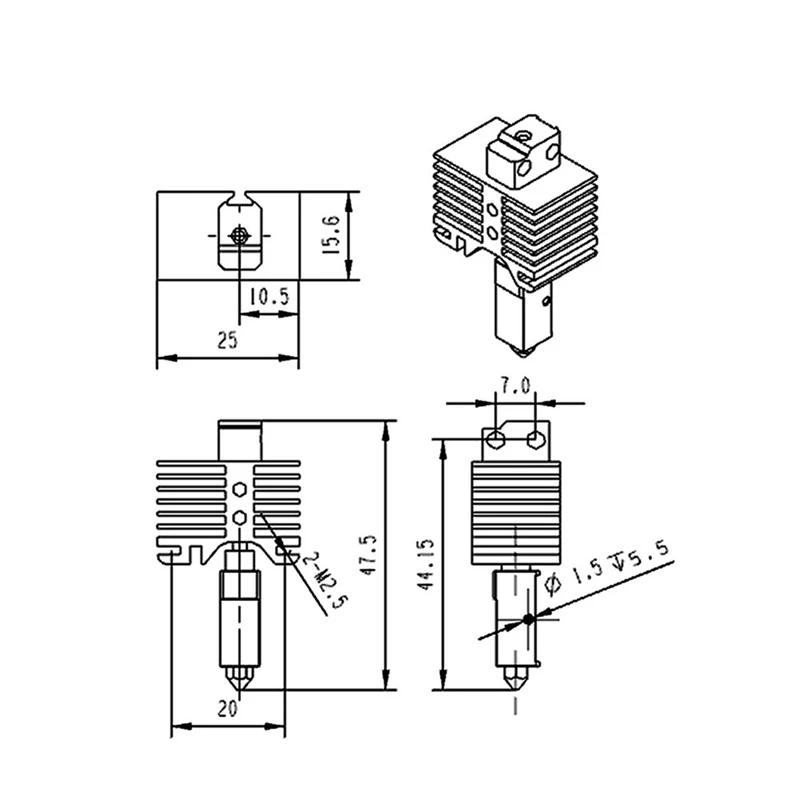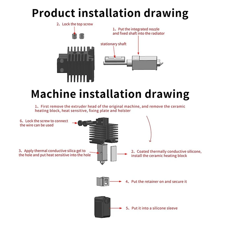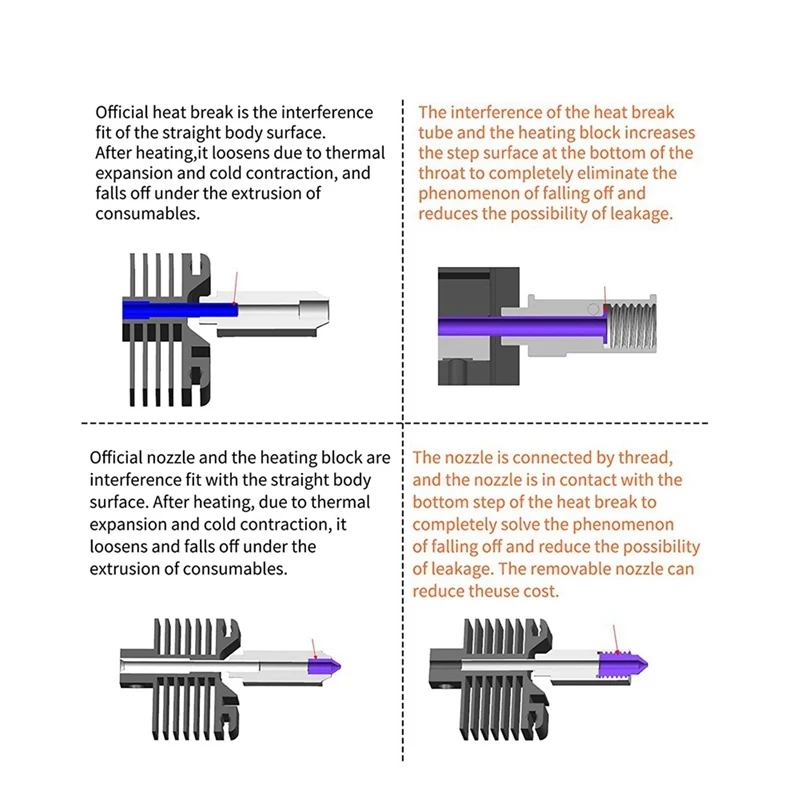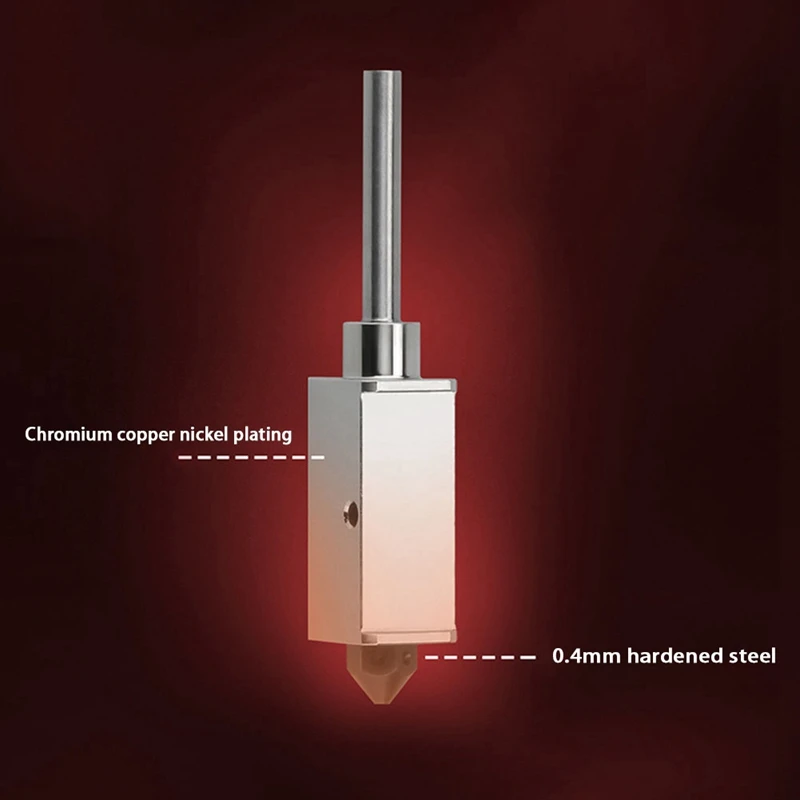 La boquilla está hecha de acero templado, y está templada y endurecida para hacerla más resistente al desgaste y prolongar su vida útil; la rugosidad de la garganta y la pared interna de la boquilla es RA0.4, lo que Reduce el fenómeno de obstrucción y mejora la calidad de impresión; la estructura de la boquilla se actualiza, El bloque de calentamiento y la garganta están conectados por roscas, lo que resuelve el problema del desprendimiento y se puede desmontar y reemplazar para reducir el costo de uso.