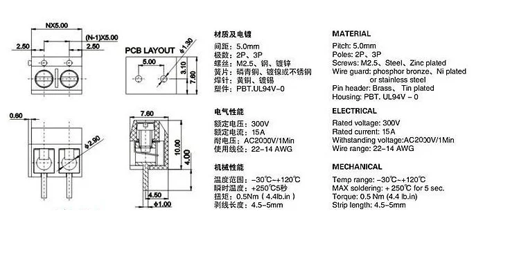 KF301 2P 3P 4P 5mm Bloque de terminales de cable de tornillo Paso de 2P/4P 5,0mm Pin recto empalmable Conector de cable PCB