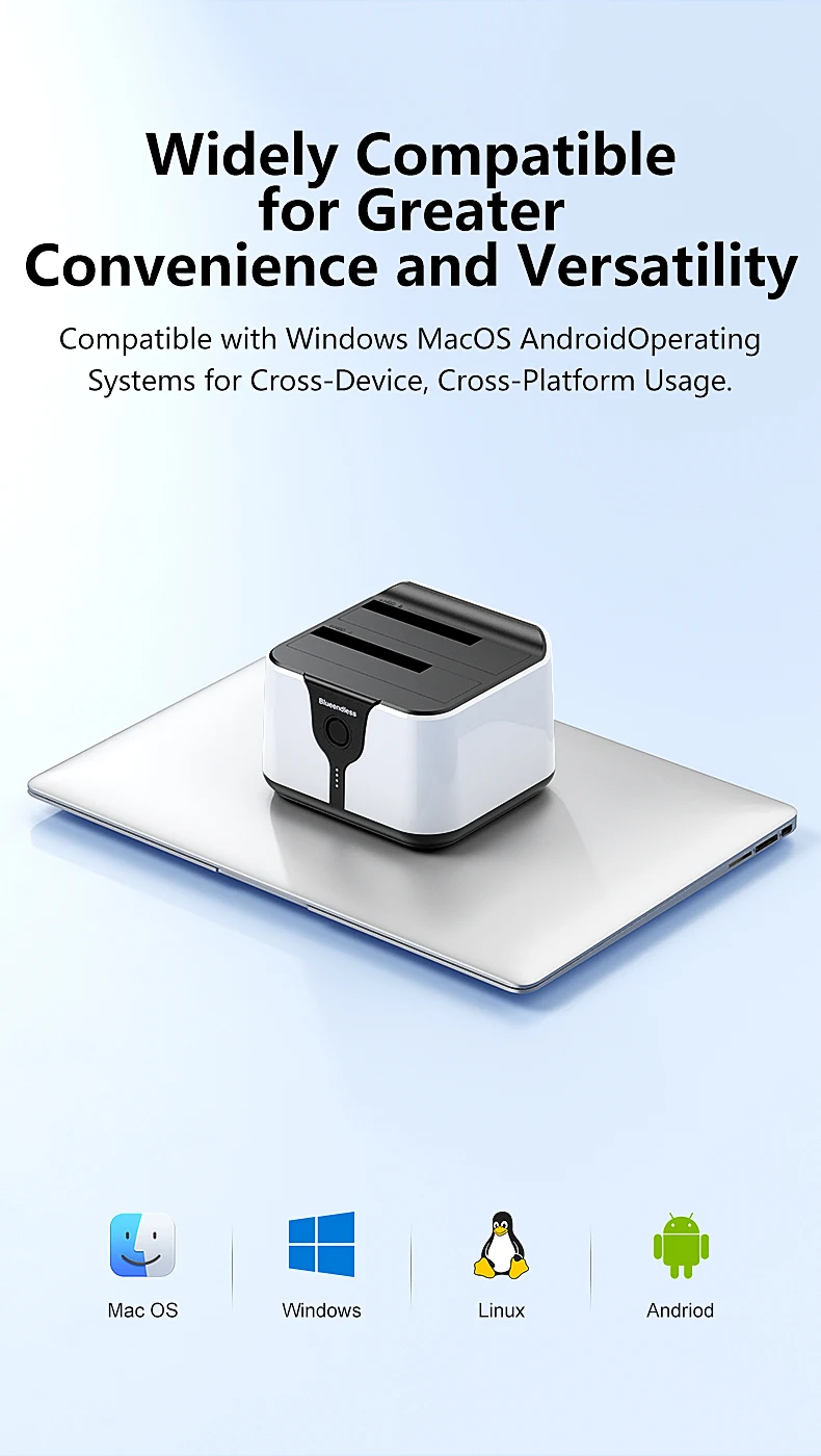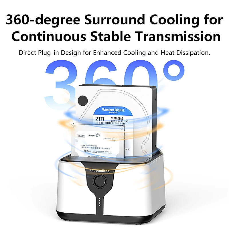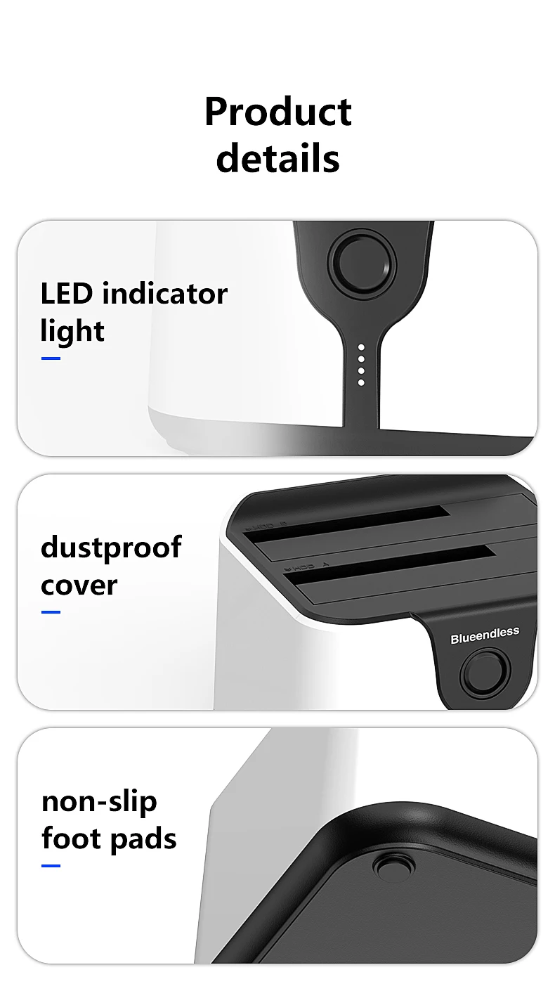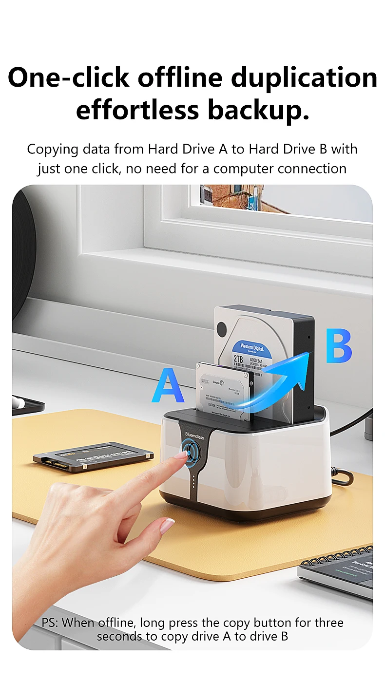 El Blueendless su base duplicadora independiente le permite duplicar/clonar un disco duro existente sin el uso de un sistema informático host, o se puede conectar a un sistema informático para usarlo como base de disco duro externo.