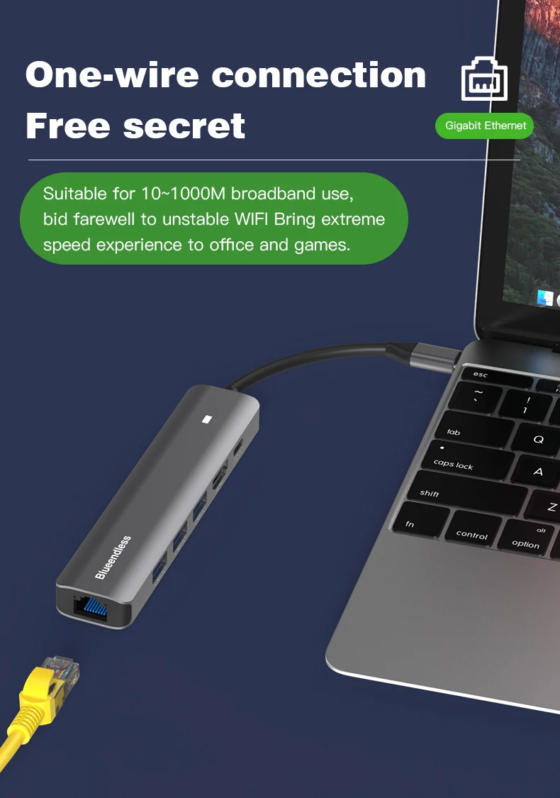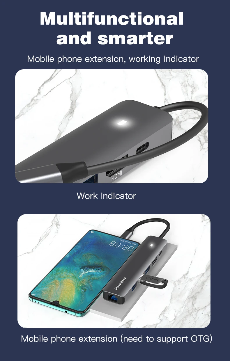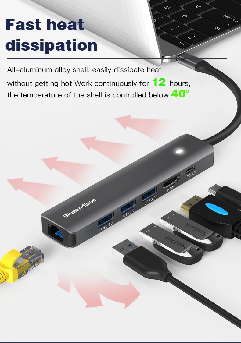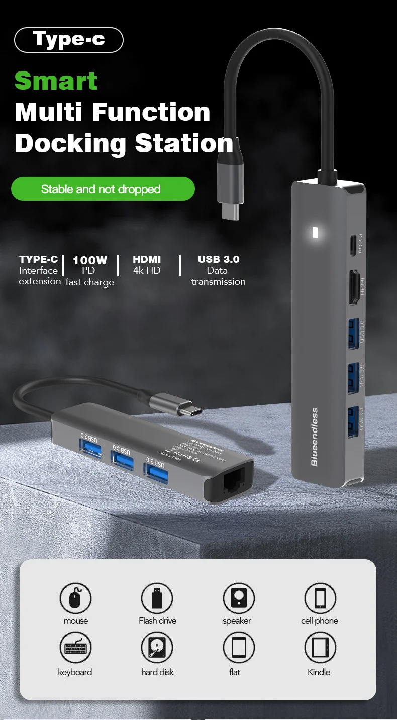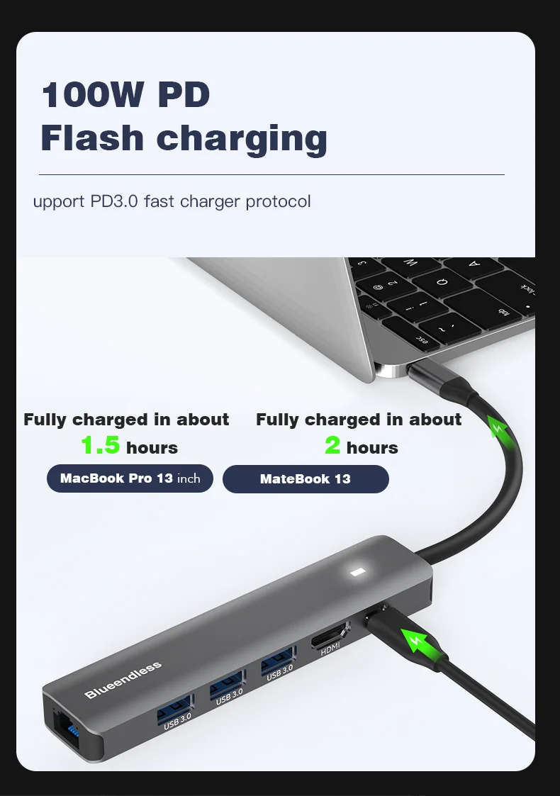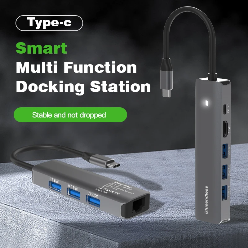 Comprar Blueendless-estación de acoplamiento múltiple con carcasa de aluminio, Adaptador tipo C, USB3.0, 5Gbps6, puertos en 1, cargador PD de 100W para ordenador portátil y Macbook, 4K30Hz