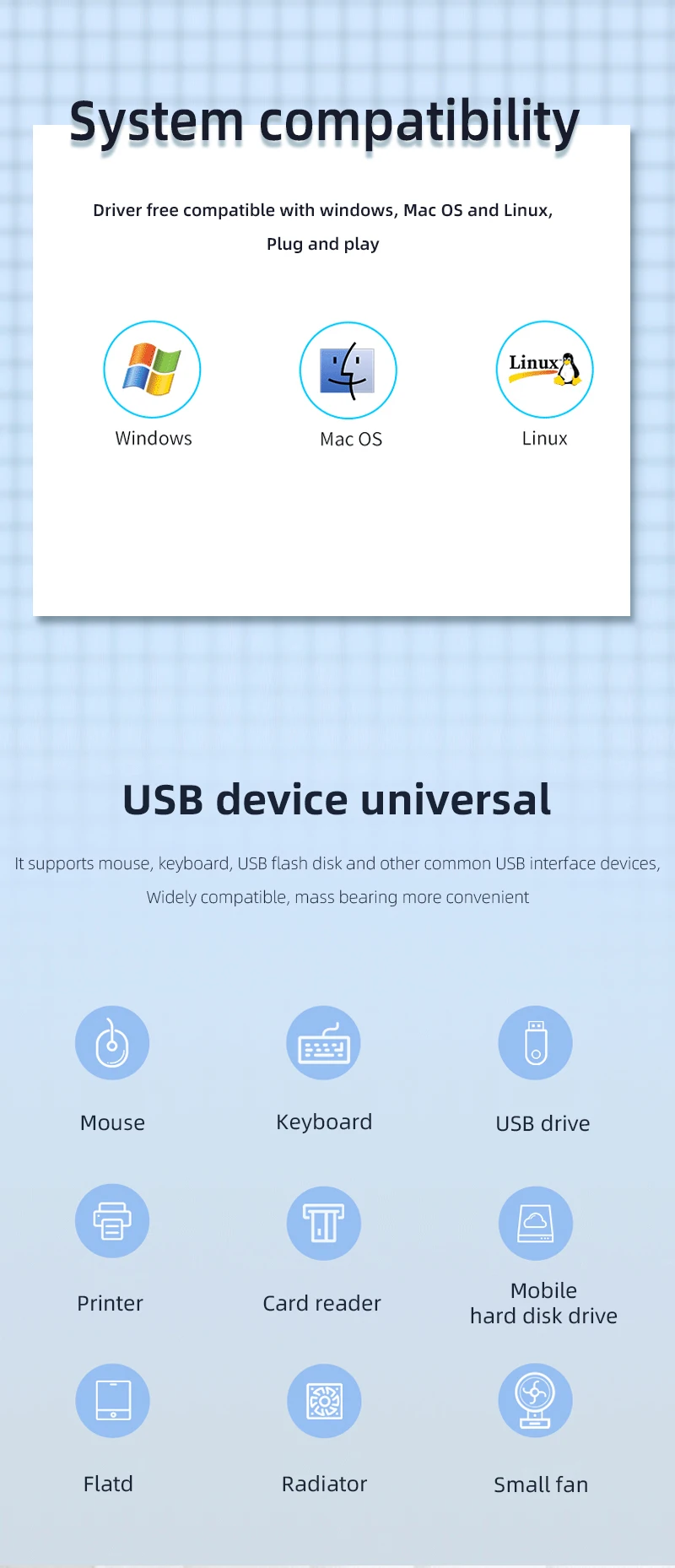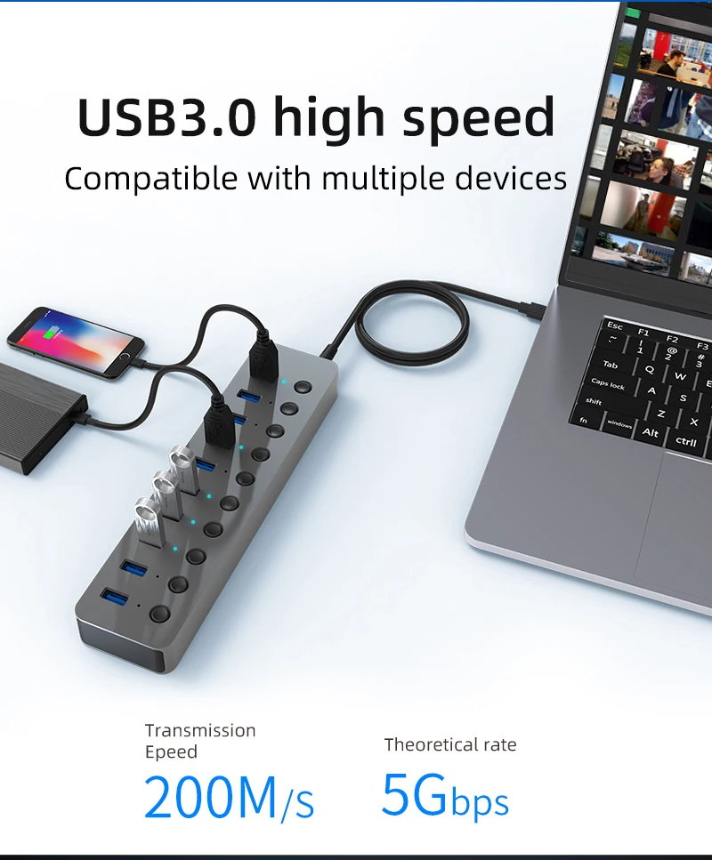 1.El concentrador de aluminio USB 3.0 ahorra tiempo de sincronización con velocidades de transferencia de datos de hasta 5 Gbps (mucho más rápido que el USB 2.0).Compatible con versiones anteriores de USB 2.0 y 1.1.