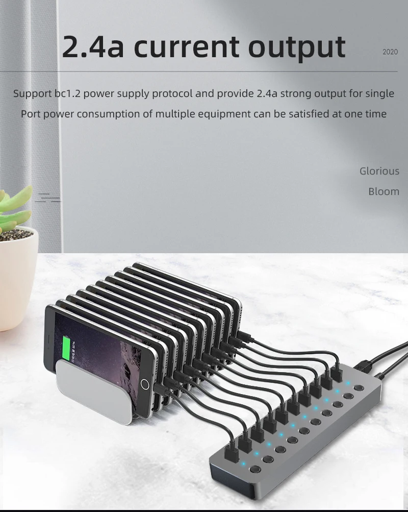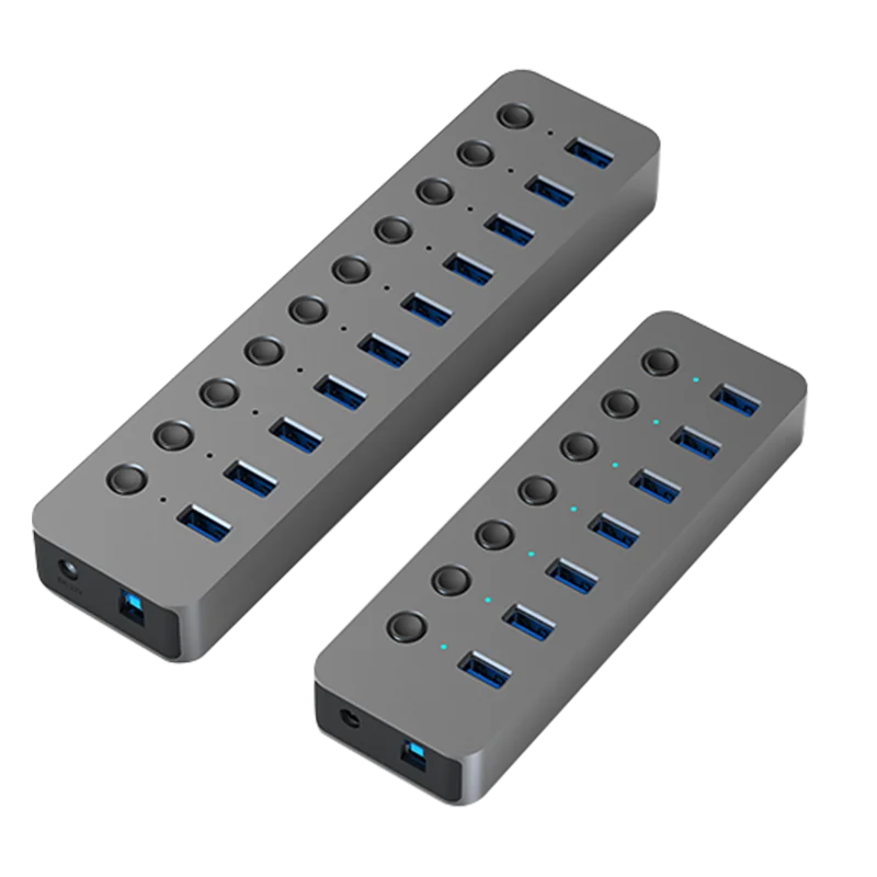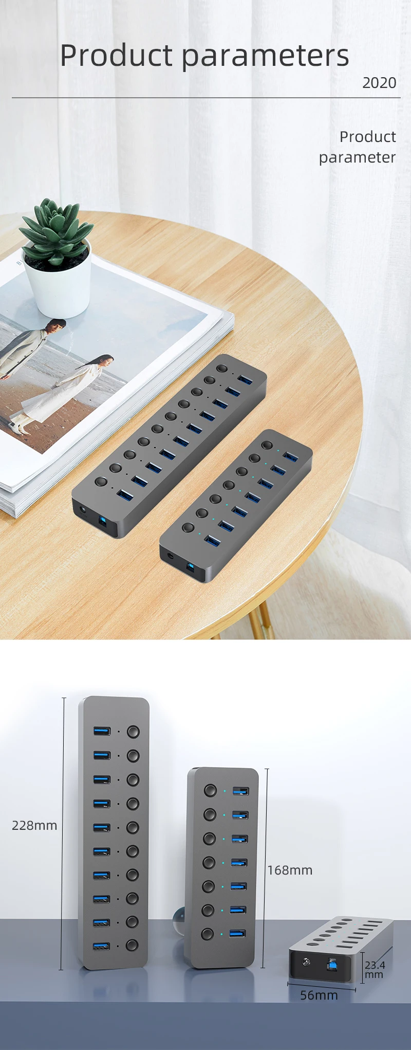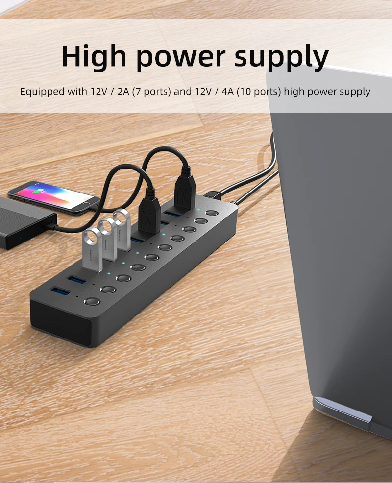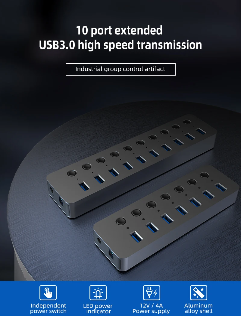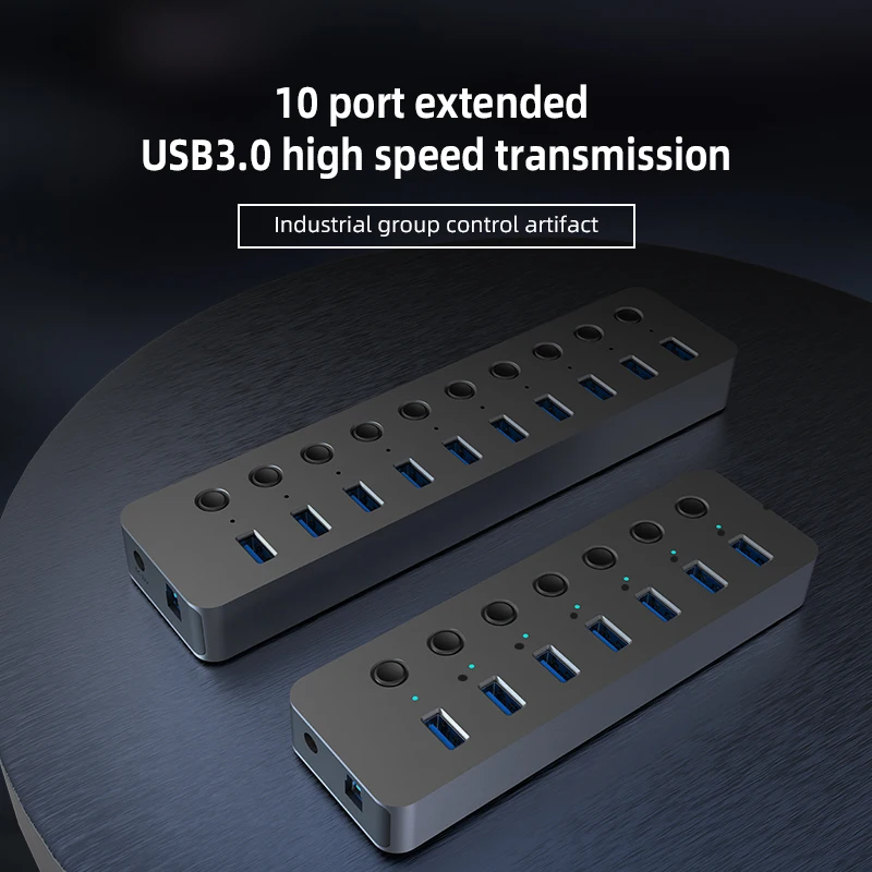 Comprar Blueendless USB Hub 3,0 7 puertos 10 puertos aleación de aluminio Shell Splitter adaptador de interruptor dividido adaptador de corriente de 12V para PC Macbook lapt
