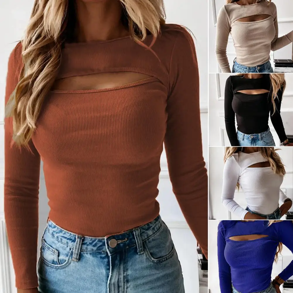 Comprar Blusa de fondo ligera Popular para mujer, camiseta de fondo elástica calada en el pecho para Otoño e Invierno