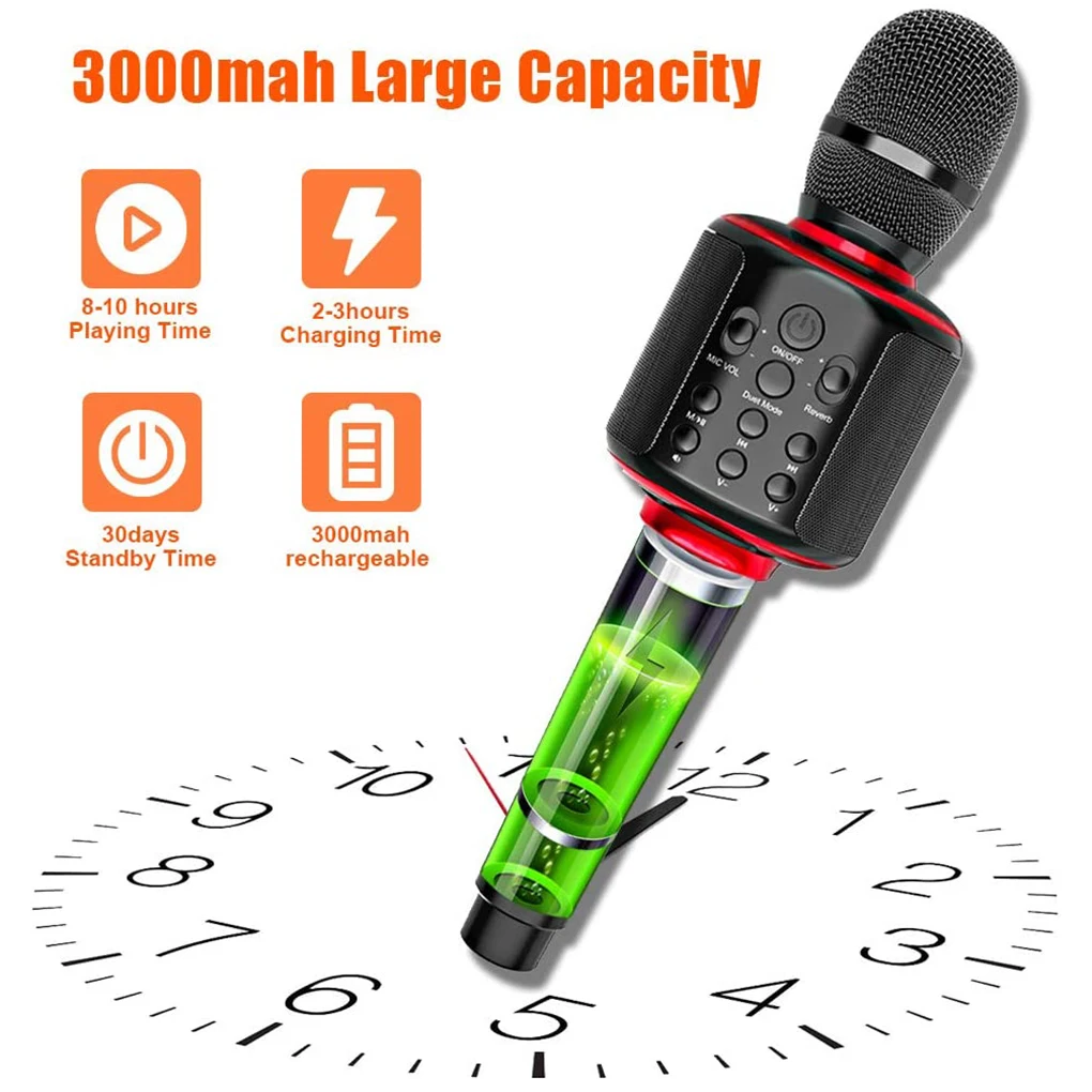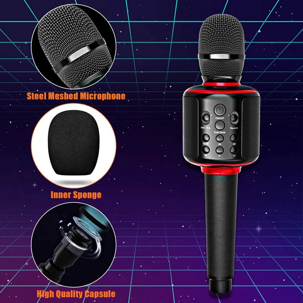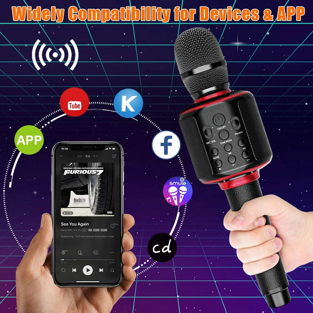 Este micrófono de karaoke inalámbrico es adecuado para portátiles, teléfonos inteligentes, televisores inteligentes y otros dispositivos, y admite dúo, eco, ajuste de volumen, voz, conexión compatible con Bluetooth, karaoke cantando y tocando música.