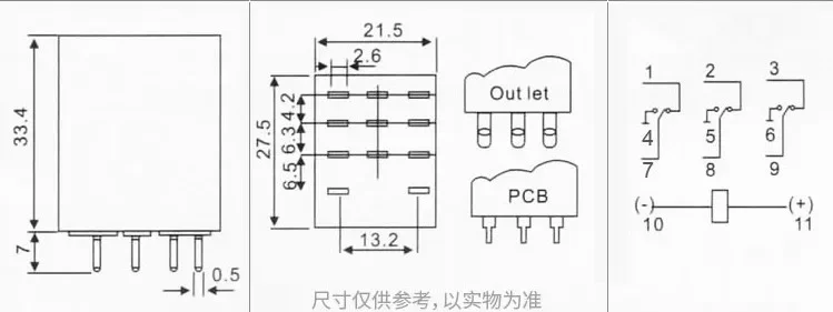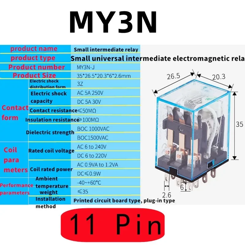 Modelo N °: MY3NJ/HH53P/HH53P/HH53N/B/N/-1/2Voltaje de la bobina: DC12V DC24V AC110V AC220VCapacidad de contacto: 5ATipo: 11 pines 3NO 3NCIndicación de trabajo: Lámpara LEDTamaño total (aprox.) : 27x20,5x42mm(L * W * H)