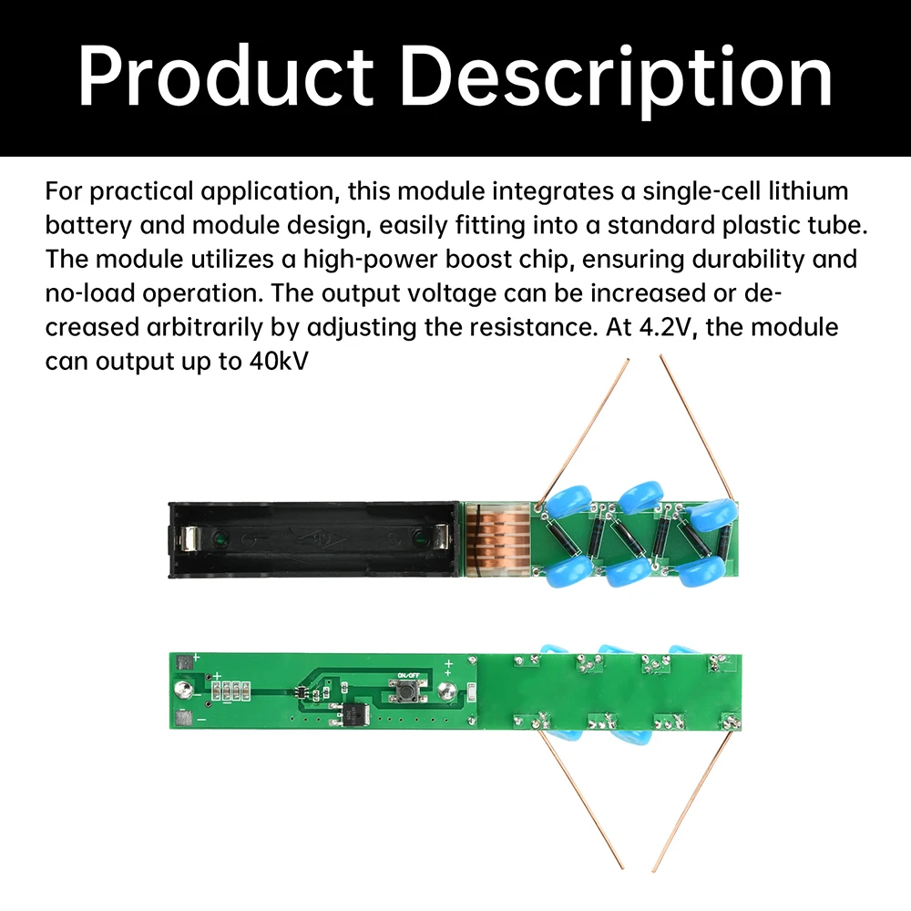1.Aumenta el alto voltaje de 3,7 V CC a 40 KV, cumpliendo con los requisitos de alto voltaje para equipos o experimentos especializados