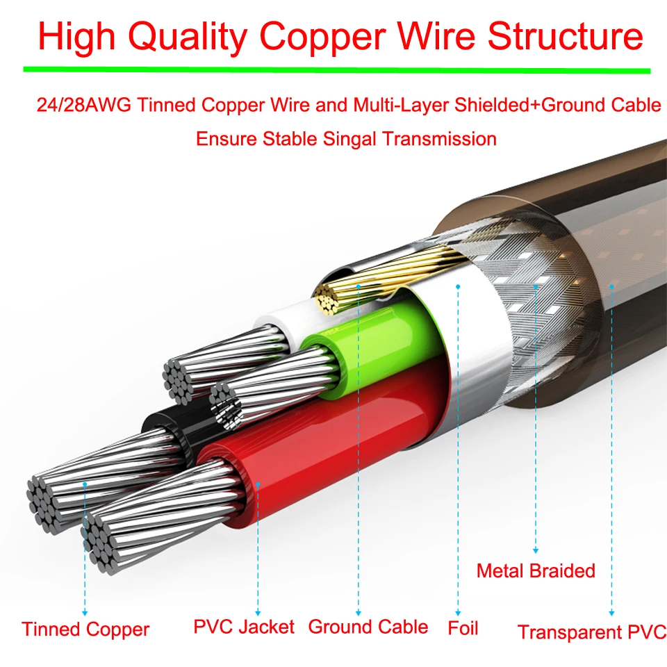3. Lámina interior de doble blindaje + blindaje trenzado, diseño de núcleo de cobre puro de 24AWG + 28AWG minimiza la comunicación cruzada para evitar errores y ayuda a prevenir interferencias electromagnéticas y garantiza una transmisión de datos confiable