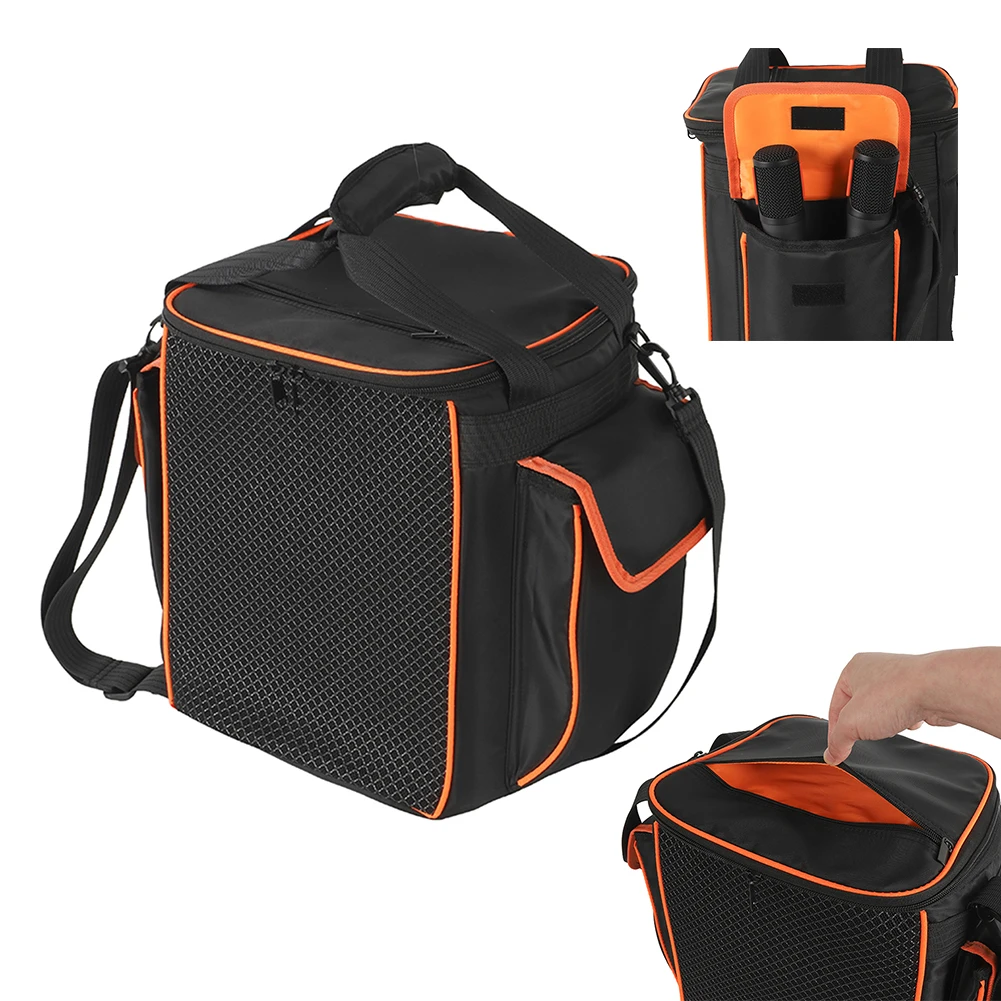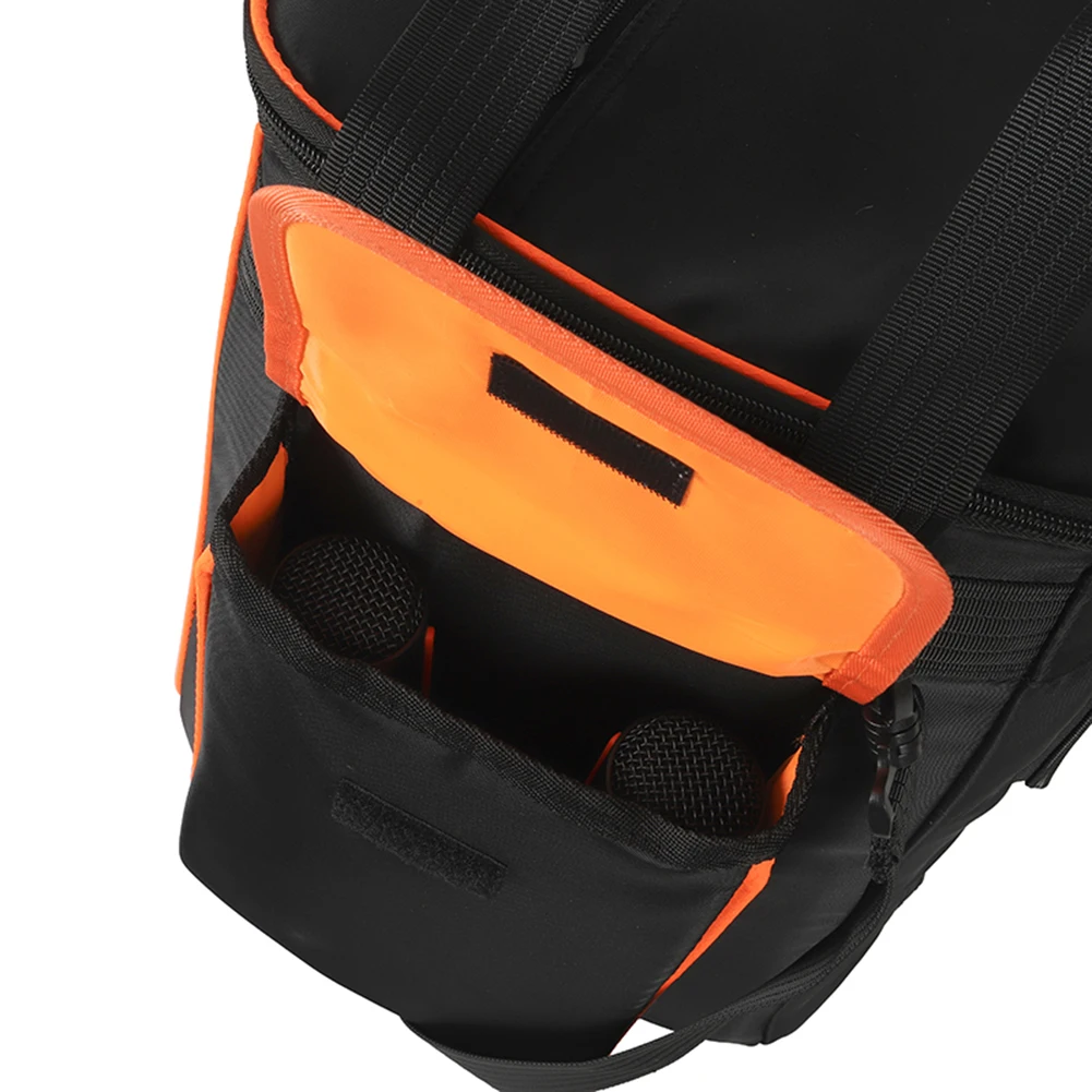 2. Buen almacenamiento:Con compartimentos en capas en ambos lados, puedes guardar un micrófono y objetos pequeños.El diseño frontal de malla permite que la calidad del sonido permanezca sin verse afectada.La apertura trasera admite la carga sin quitarla.