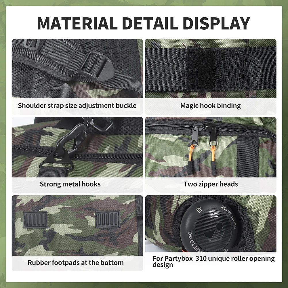 5. Diseño:La parte superior de la mochila está diseñada con una ventana transparente, que puede ver claramente el interruptor y el botón de ajuste de volumen. Para PARTYBOX 310 bolsillo de apertura retráctil también está diseñado en la parte superior. El lateral de la mochila está diseñado con una abertura de cremallera, que se adapta perfectamente al altavoz compatible con Bluetooth, lo que lo hace más cómodo de usar. Se añade una hebilla de seguridad antideslizante a la hebilla. La parte posterior de la bolsa está diseñada con esponja IC de alta elasticidad y tela de malla, que es cómoda y transpirable.