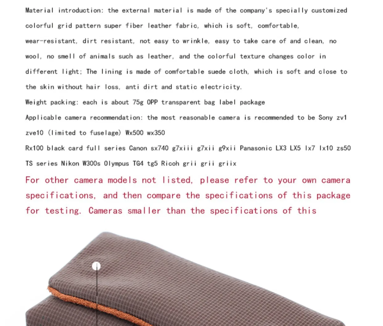 Para otros modelos de cámara no enumerados, verifique el tamaño de su cámara antes de realizar el pedido, el tamaño interno de esta bolsa es de 110*70*40mm, si su cámara es más pequeña, puede usarla.