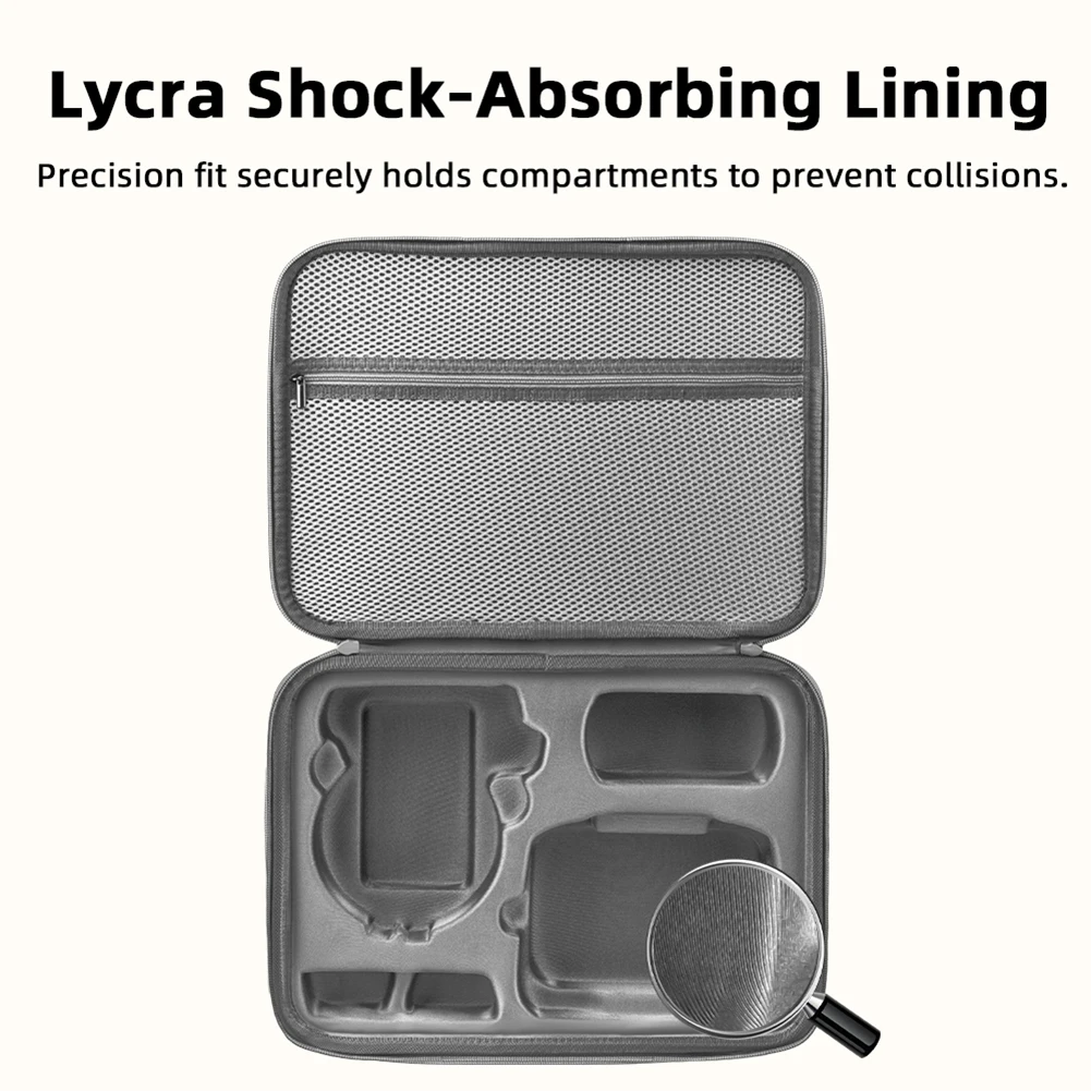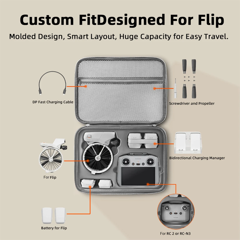 Característica:1. Diseño para DJI Flip:Específicamente moldeada con una apertura real a máquina, esta bolsa de almacenamiento de viaje cuenta con ranuras dedicadas y un diseño bien organizado.Su gran capacidad garantiza un fácil viaje.
