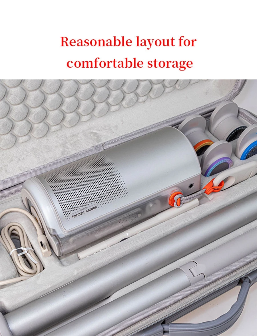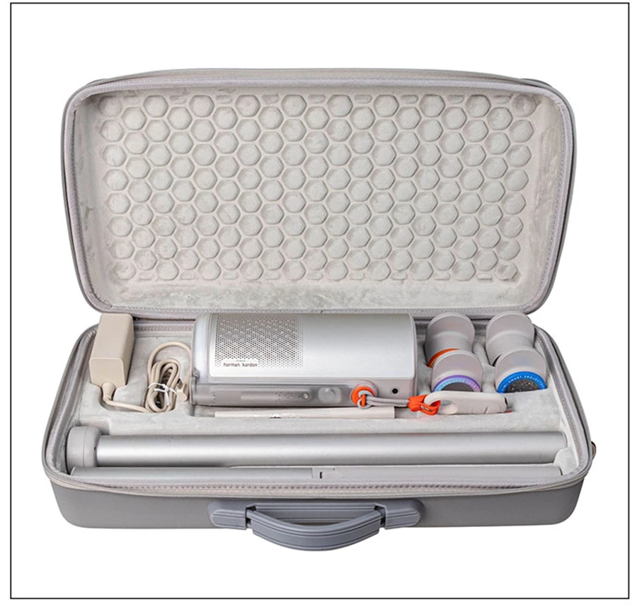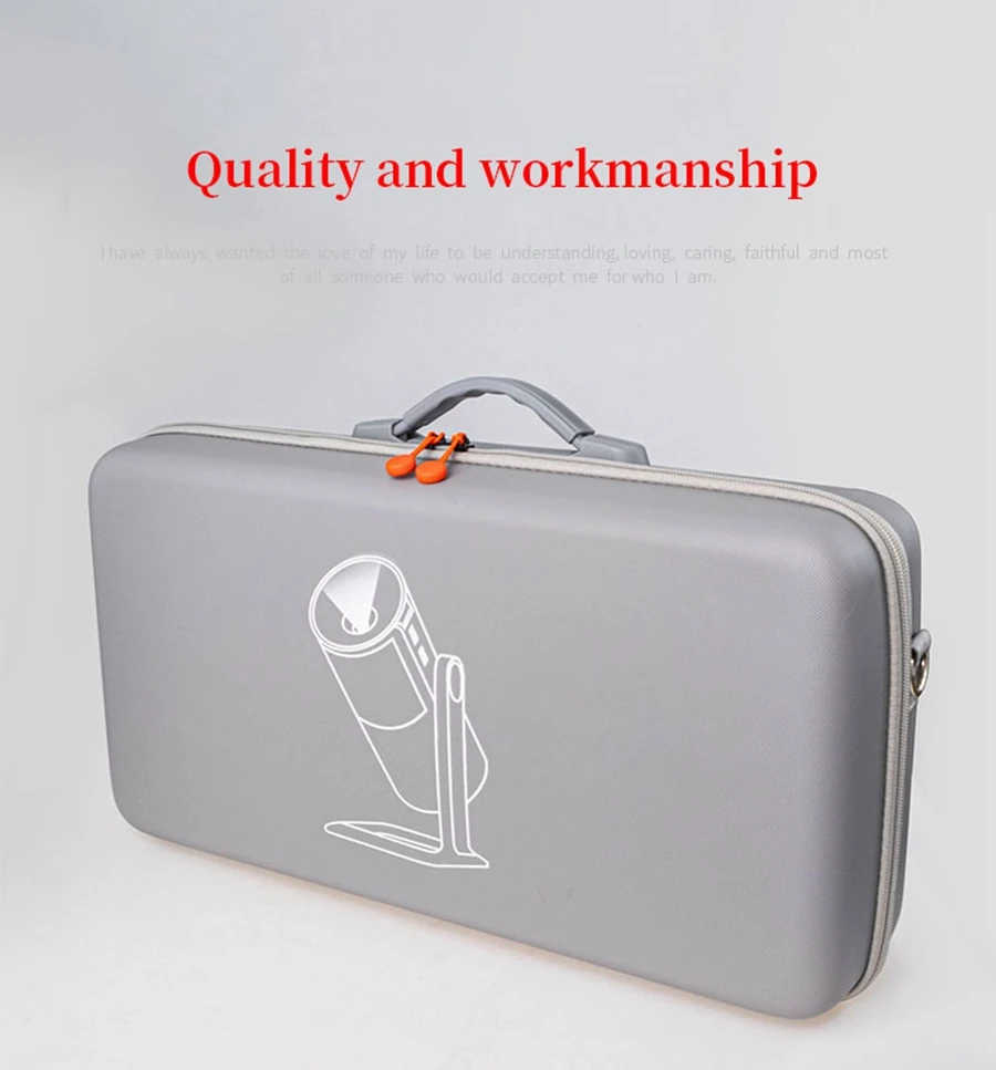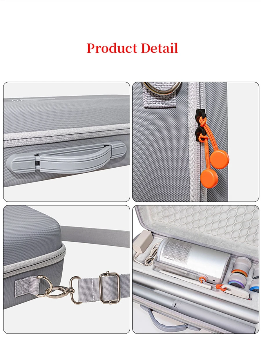 Características: Tejido EVA de calidad resistente a la compresión, resistente al desgaste, almacenamiento conveniente, Asa portátil, fácil de transportar. Puede almacenar proyector, accesorios y soporte de batería.